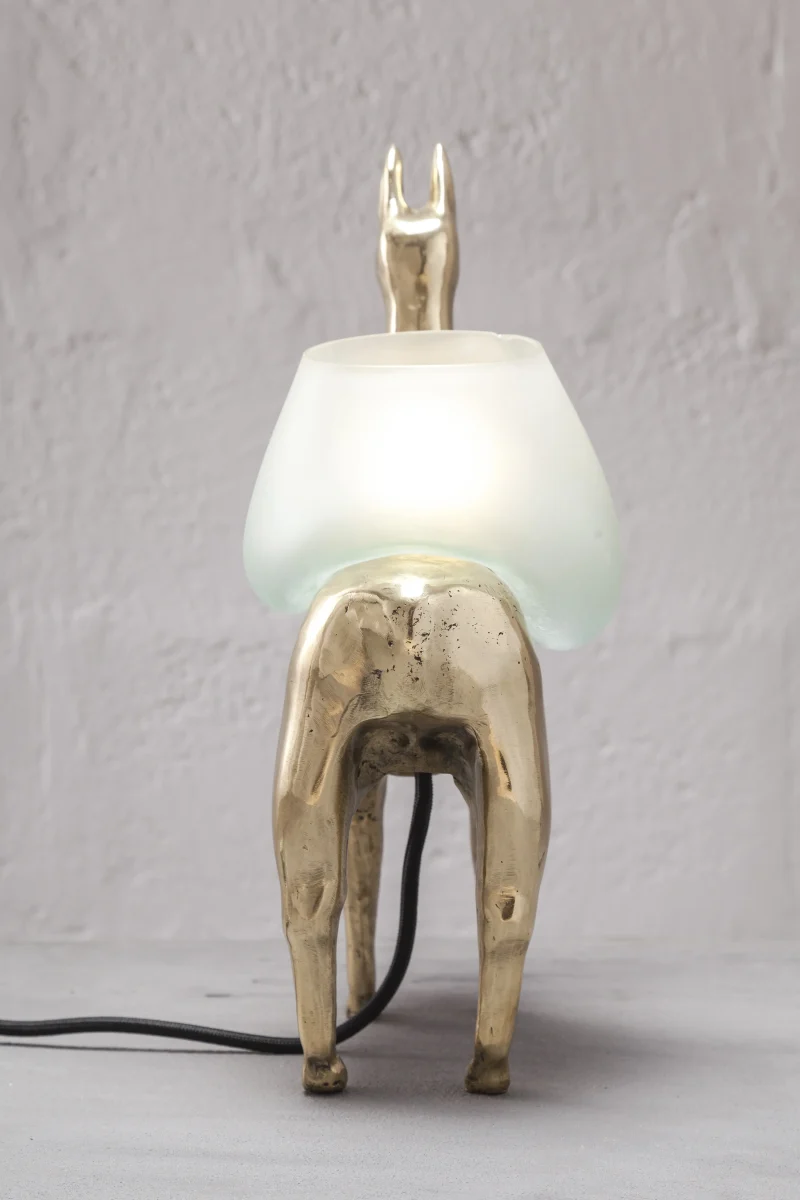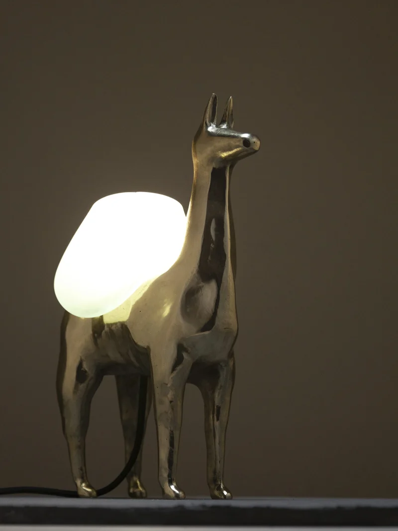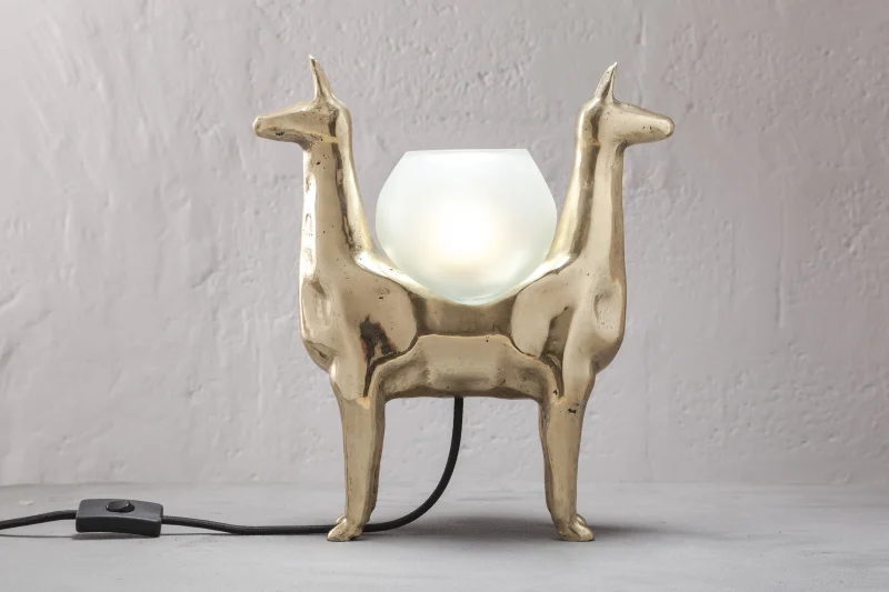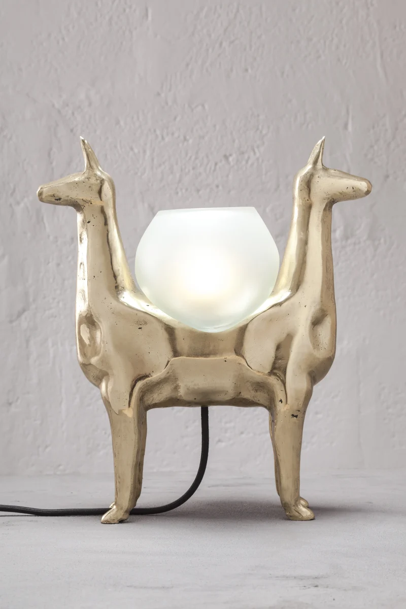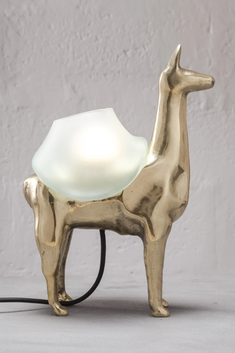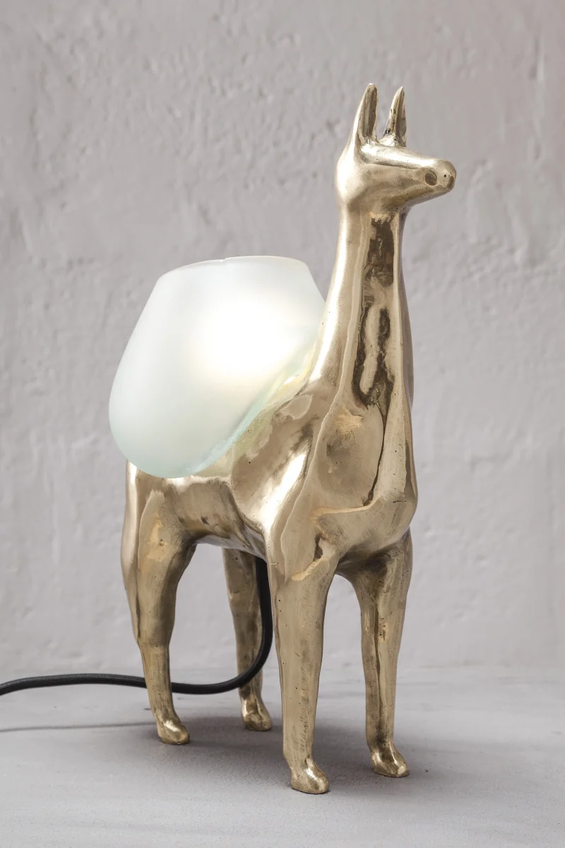 LLAMAS is a table lamp, composed of a lost-wax cast bronze body, and a blown glass lampshade. It is a reinterpretation of an archetype of llama sculptures essential within Ecuadorian artisanship. The