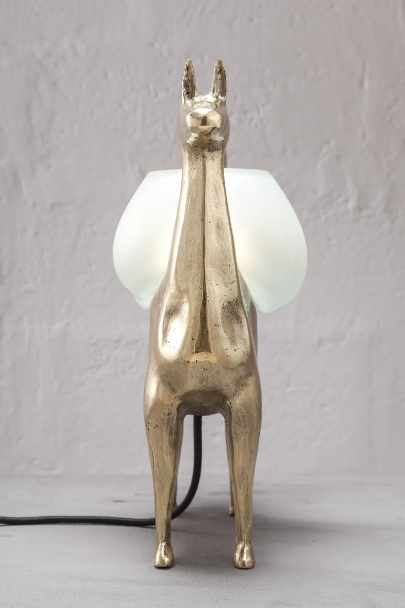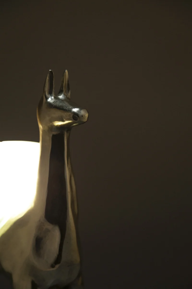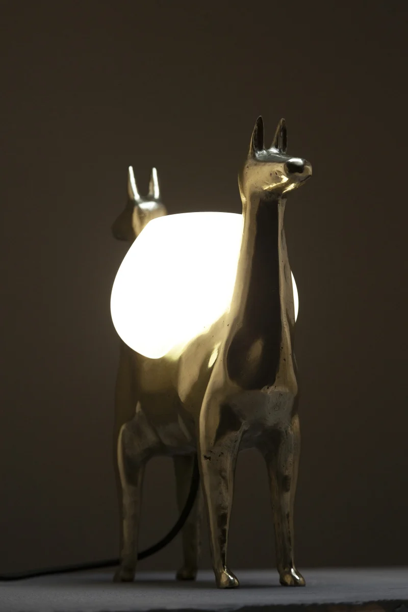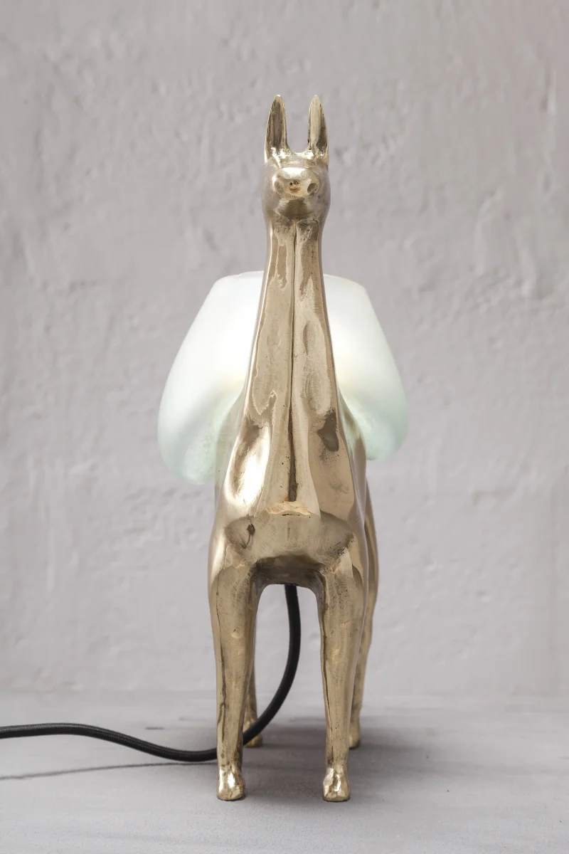 LLAMAS is a table lamp, composed of a lost-wax cast bronze body, and a blown glass lampshade. It is a reinterpretation of an archetype of llama sculptures essential within Ecuadorian artisanship. The