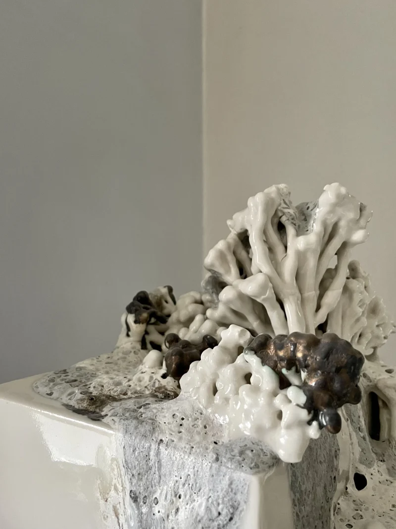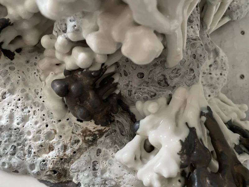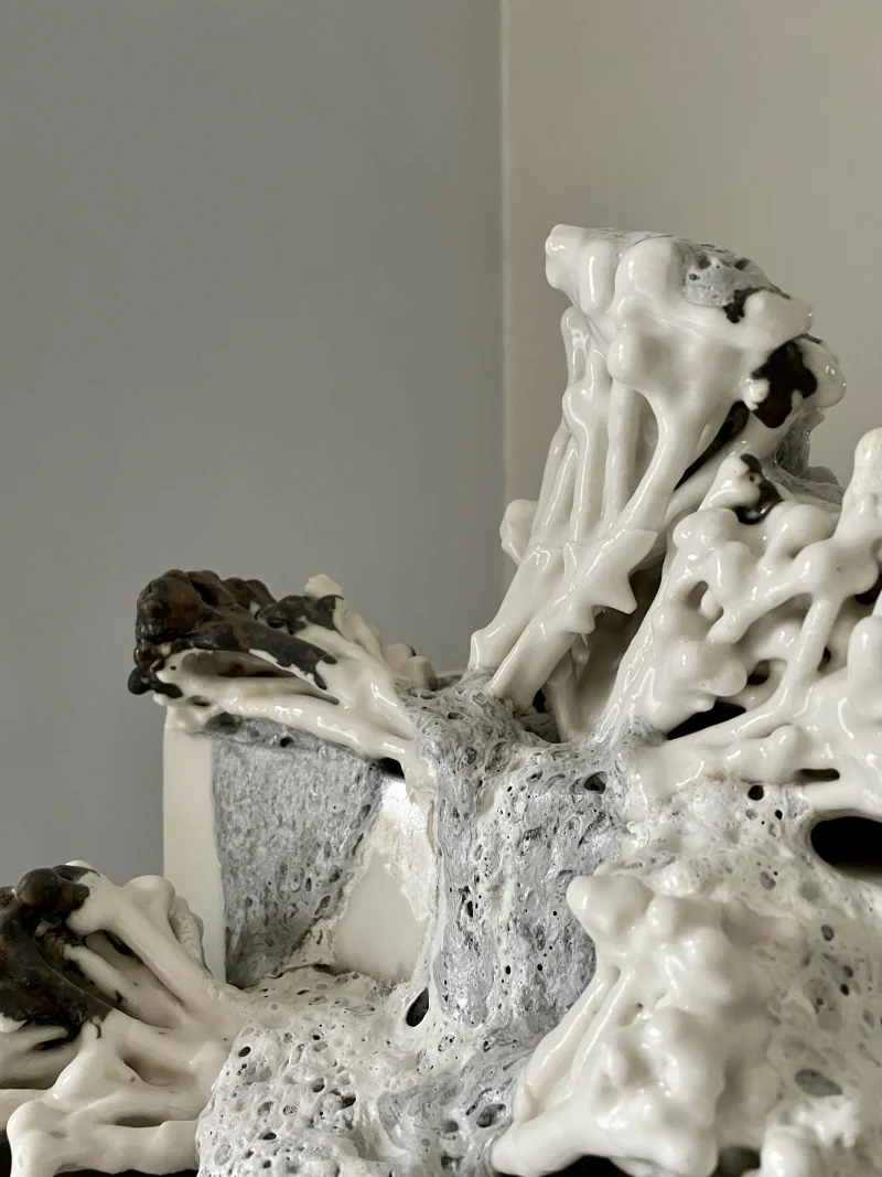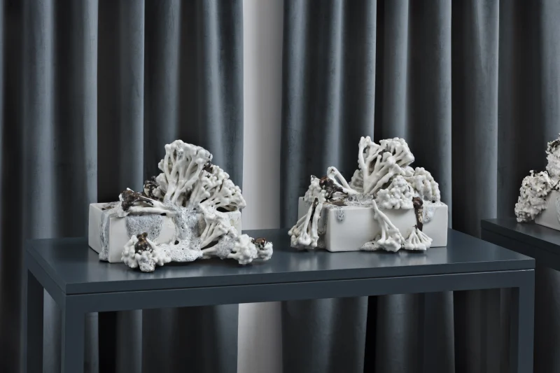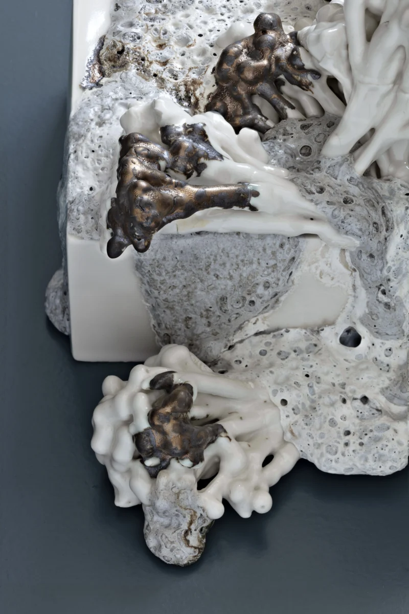 A tableau is a snapshot that holds the entire narrative. The ceramic tableau tells the story of how it became. In that way, it is a stage for a performance that has taken place in the kiln. The result balances between careful calculation and a loss of control. The dynamic shaping is stopped when the heat is switched off, leaving an imprint of the processes that we are intimately defined by – growth, decay, gravity, attraction, and adaption.