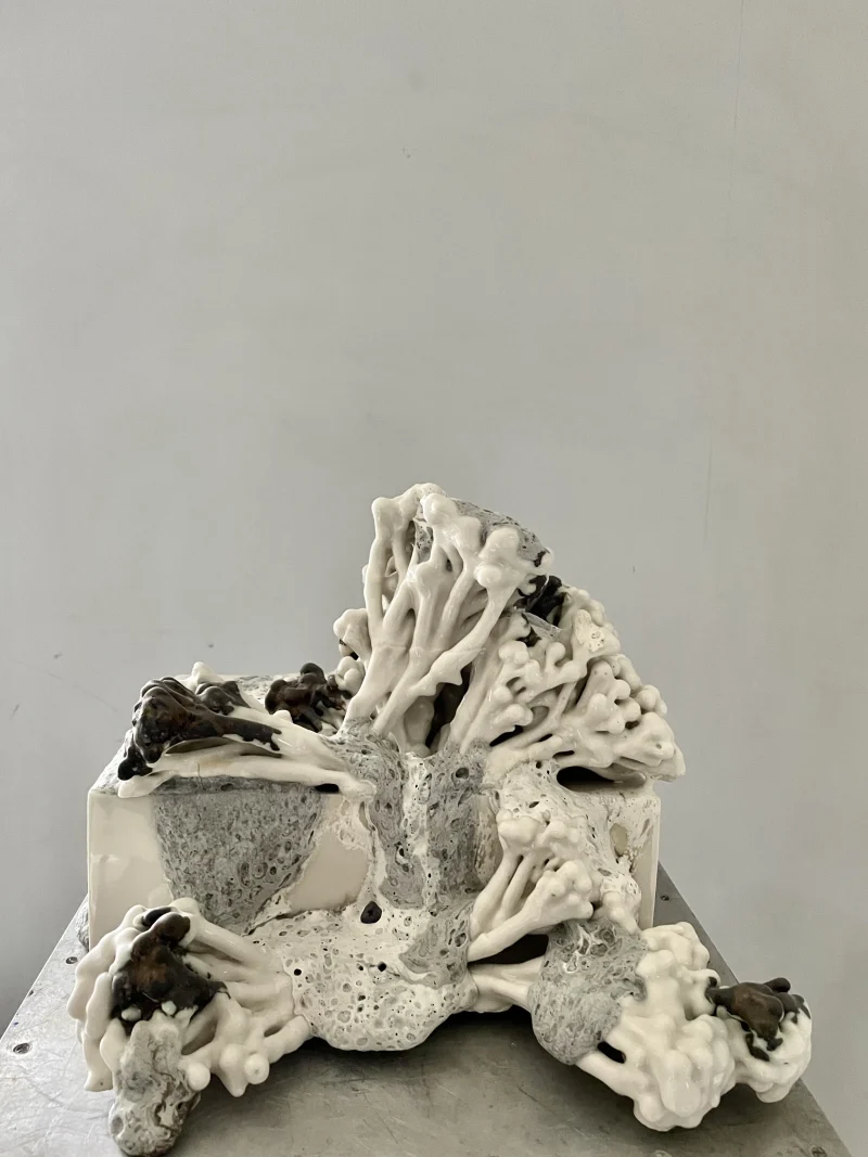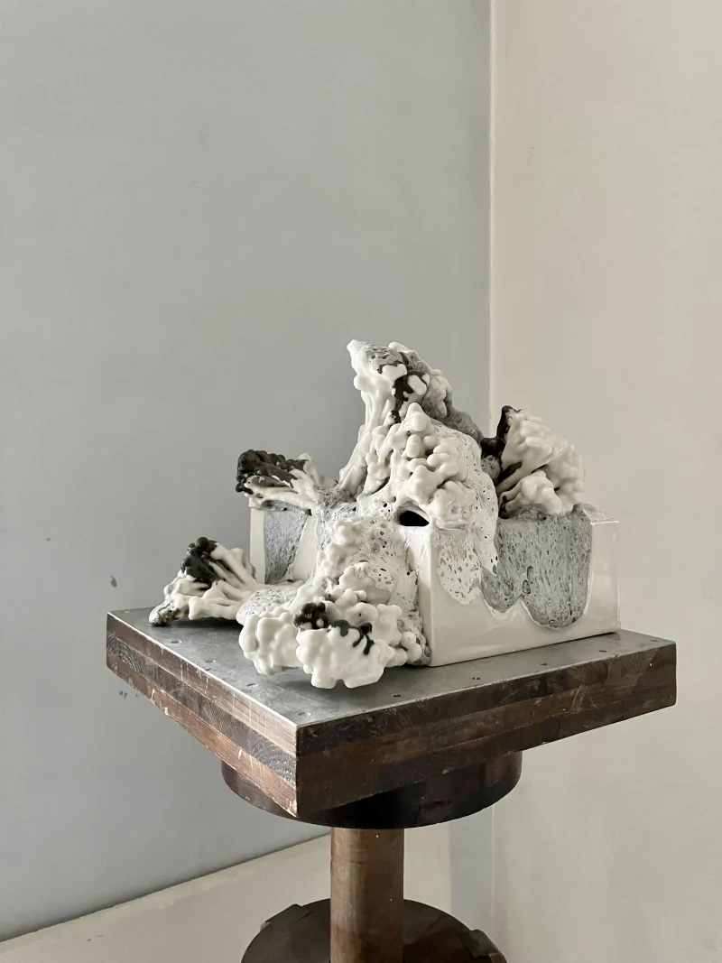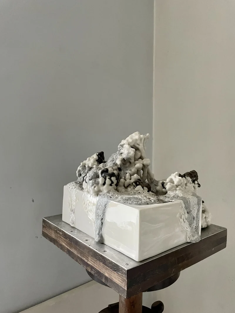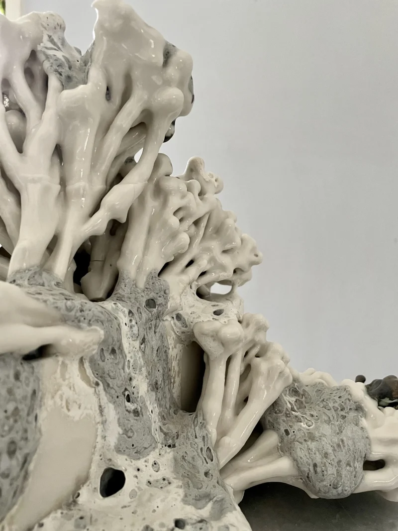 A tableau is a snapshot that holds the entire narrative. The ceramic tableau tells the story of how it became. In that way, it is a stage for a performance that has taken place in the kiln. The result balances between careful calculation and a loss of control. The dynamic shaping is stopped when the heat is switched off, leaving an imprint of the processes that we are intimately defined by – growth, decay, gravity, attraction, and adaption.
