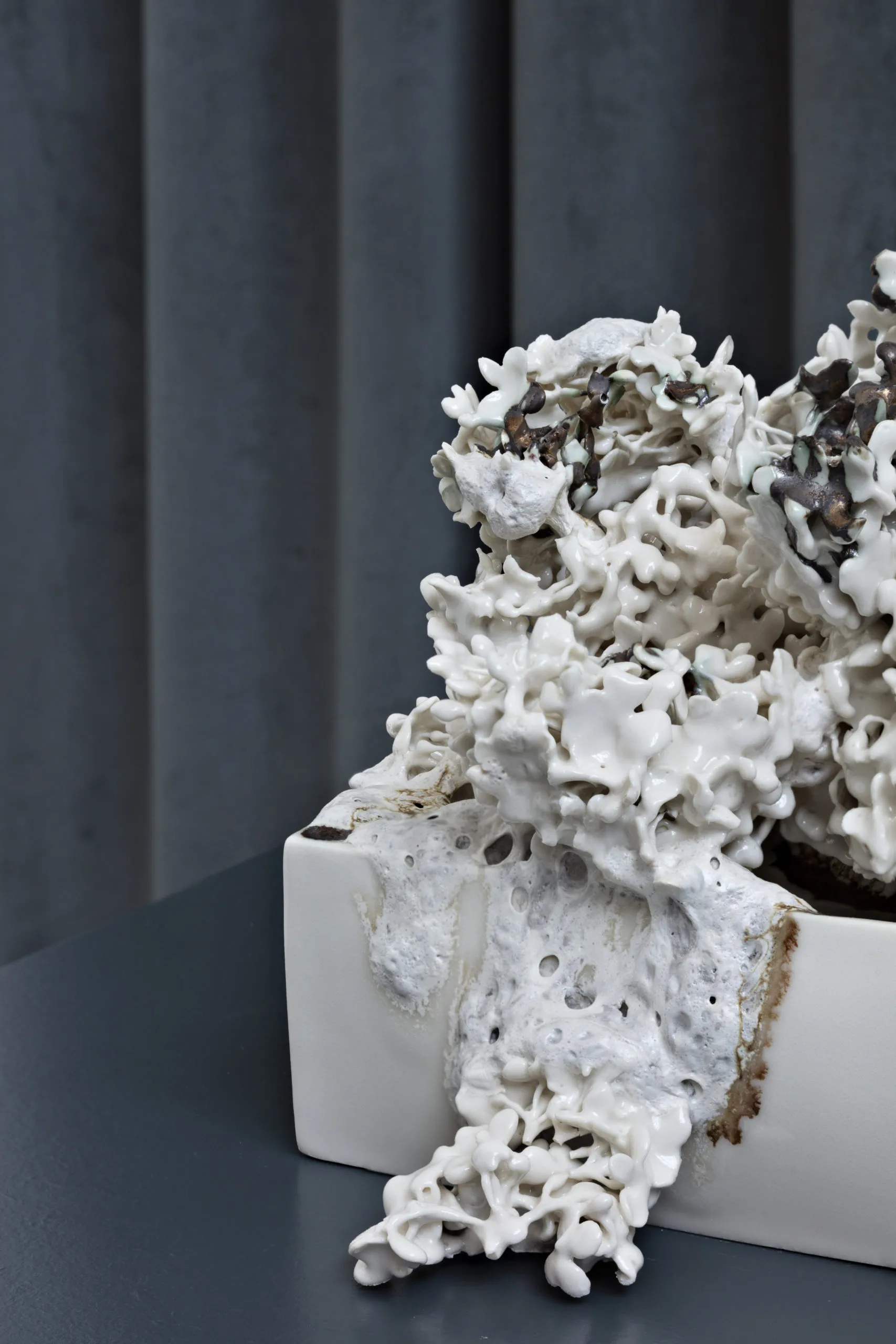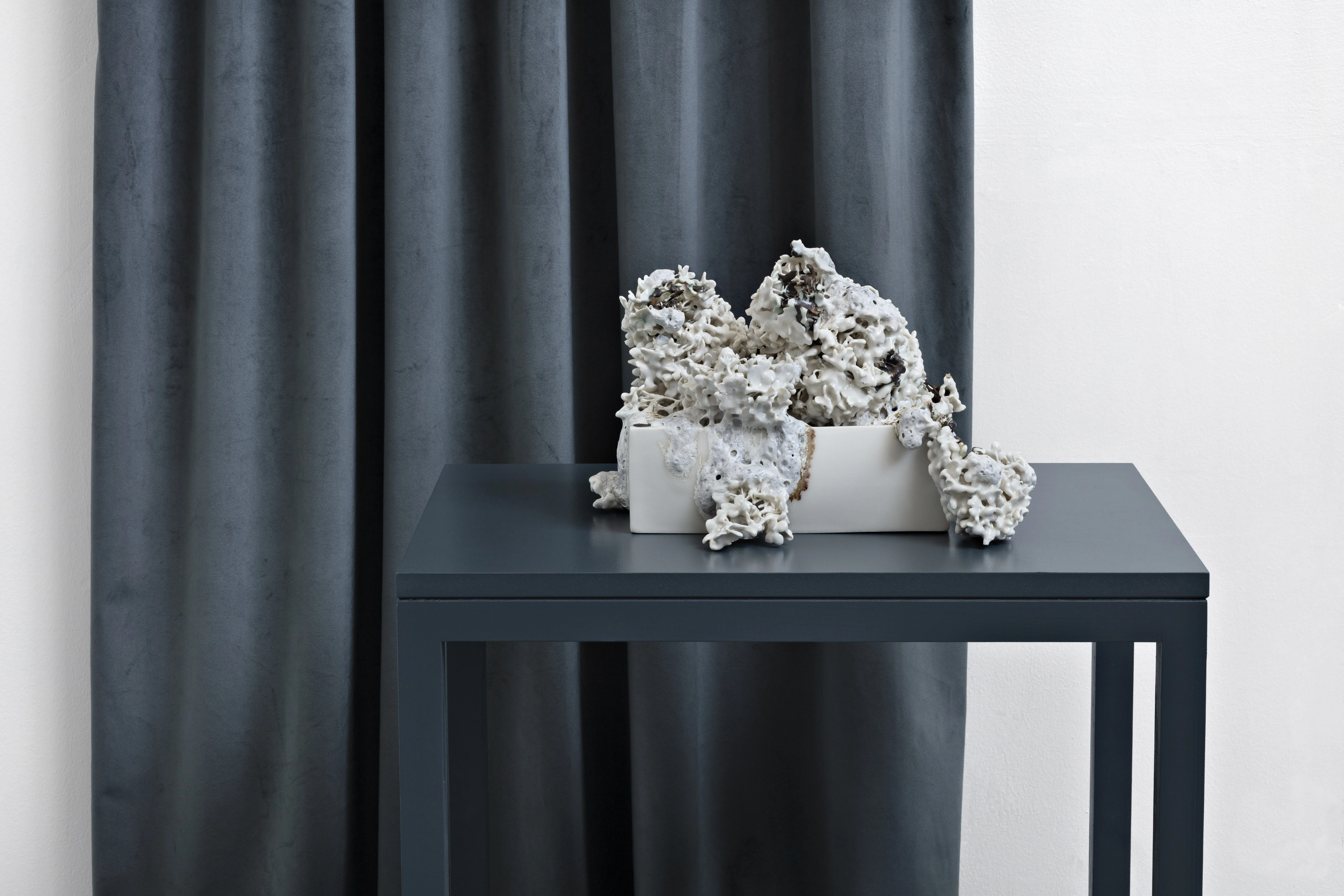 A tableau is a snapshot that holds the entire narrative. The ceramic tableau tells the story of how it became. In that way, it is a stage for a performance that has taken place in the kiln. The result balances between careful calculation and a loss of control. The dynamic shaping is stopped when the heat is switched off, leaving an imprint of the processes that we are intimately defined by – growth, decay, gravity, attraction, and adaption.