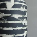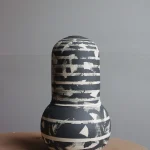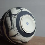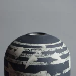 This stoneware vessel was inspired by the rooftops seen from below my studio window. They catch my attention with their black tar surfaces interrupted by large stripes of white paint. I wanted to translate that into this vessel. Thrown with white stoneware, this piece shows random brushstrokes of black underglaze, with horizontal bands of unglazed stoneware. This would be good on a corner of a cradenza, highlighted with branches of budding quince.