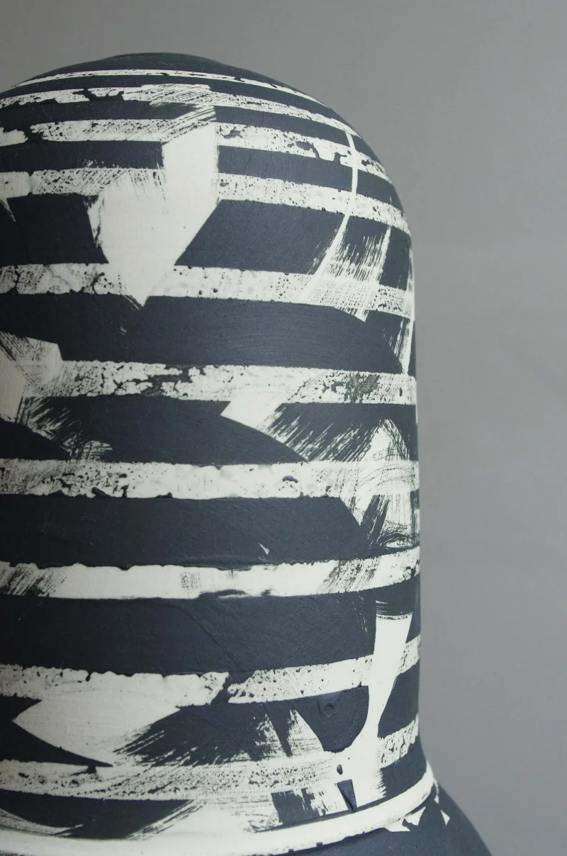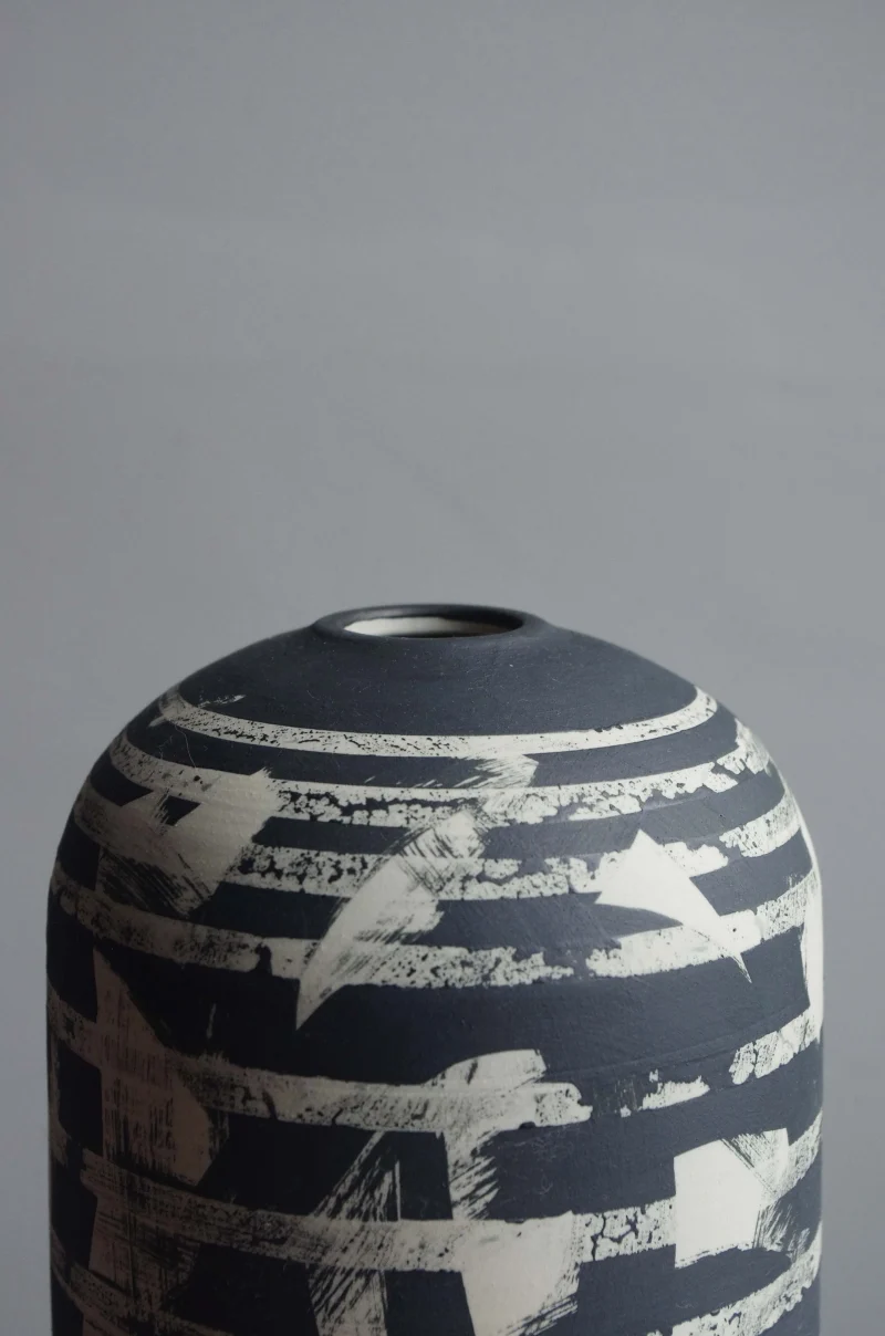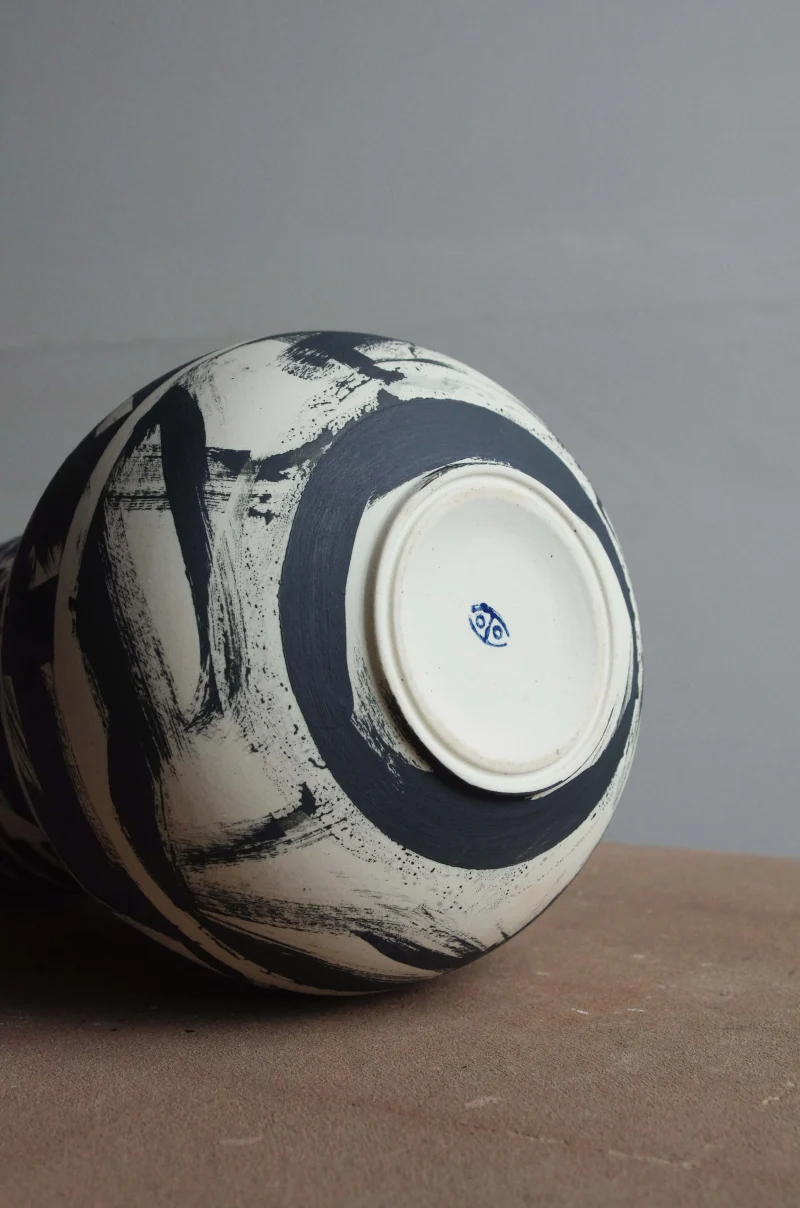This stoneware vessel was inspired by the rooftops seen from below my studio window. They catch my attention with their black tar surfaces interrupted by large stripes of white paint. I wanted to translate that into this vessel. Thrown with white stoneware, this piece shows random brushstrokes of black underglaze, with horizontal bands of unglazed stoneware. This would be good on a corner of a cradenza, highlighted with branches of budding quince.