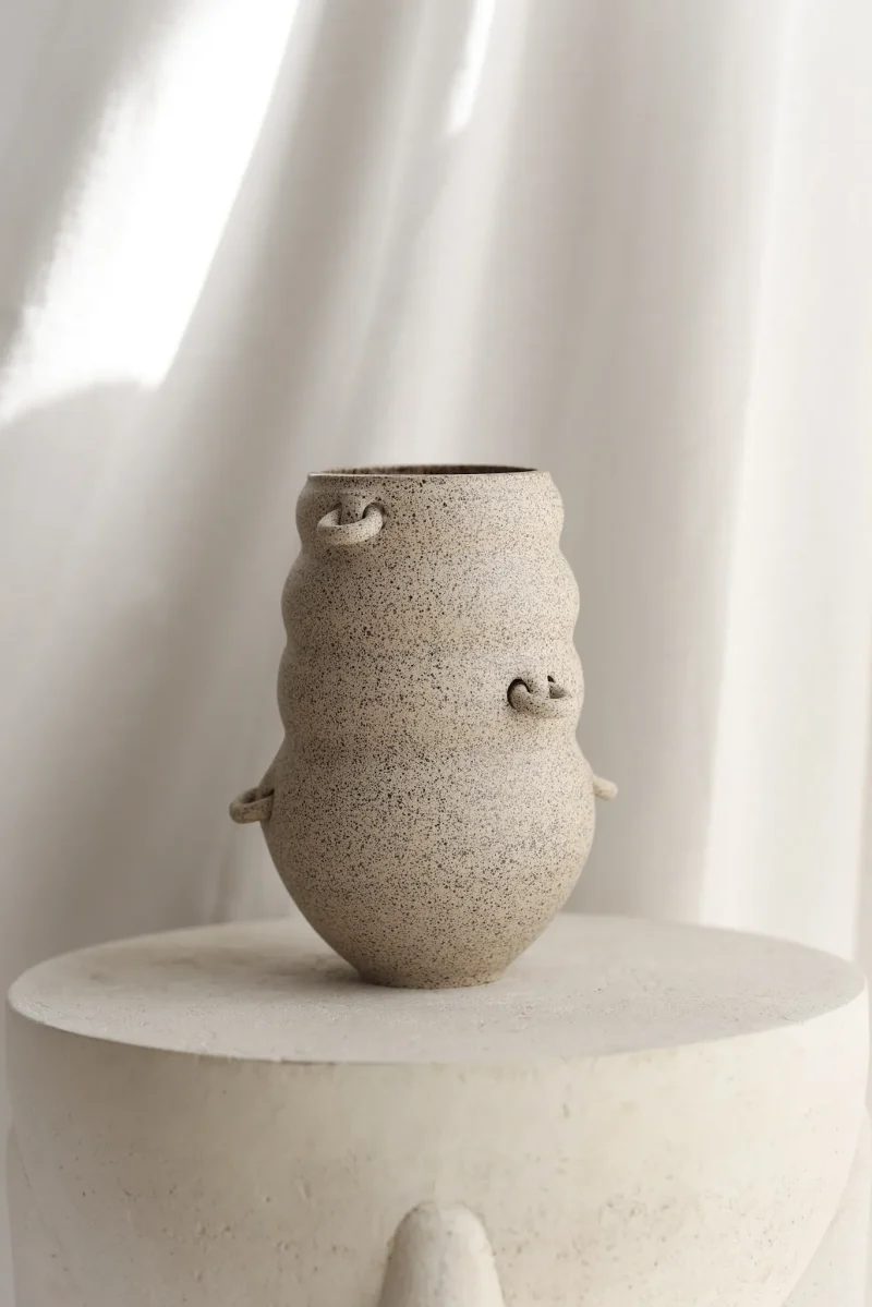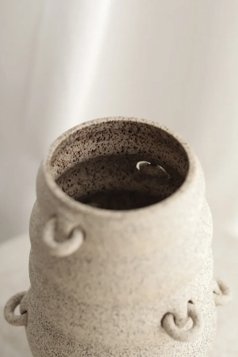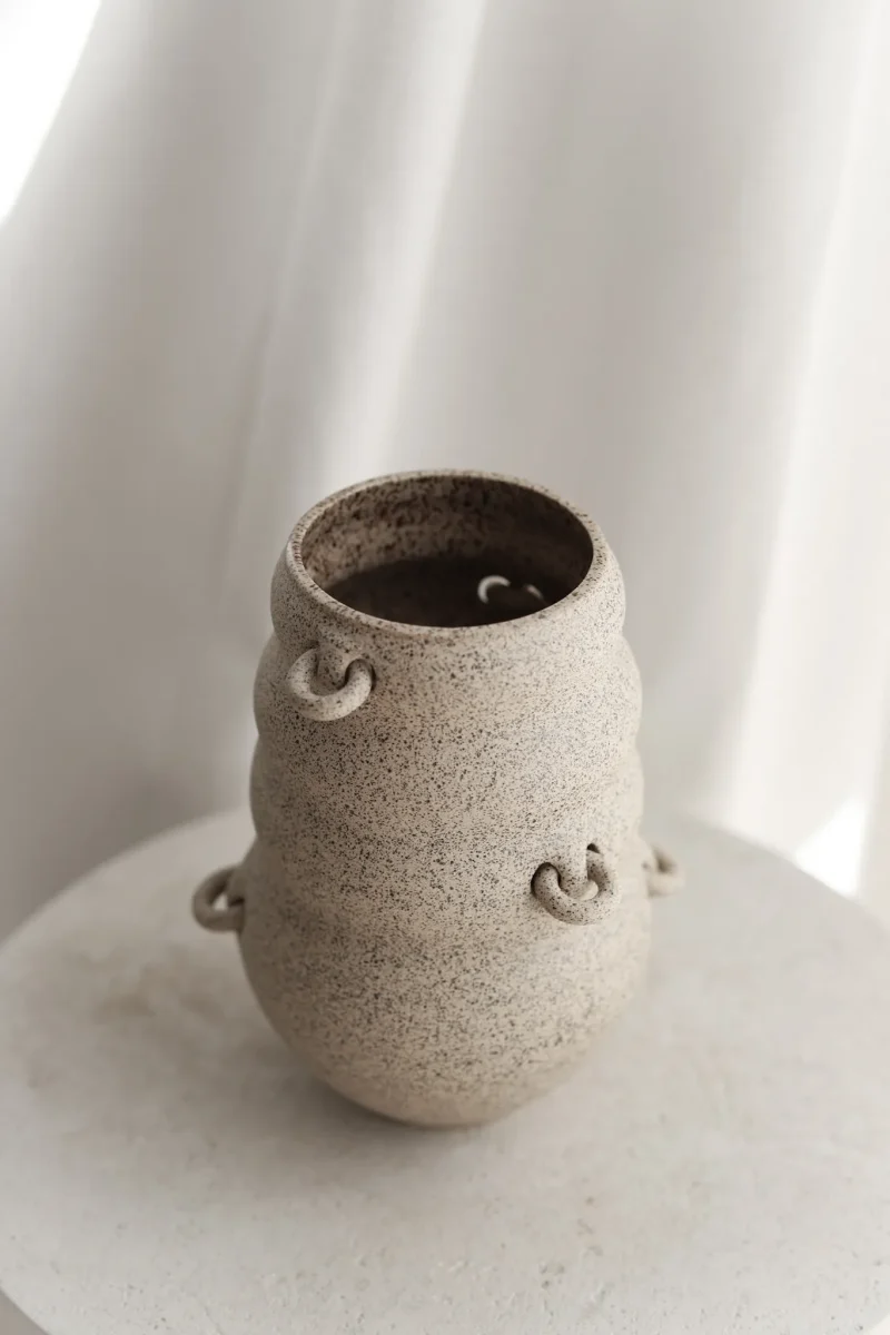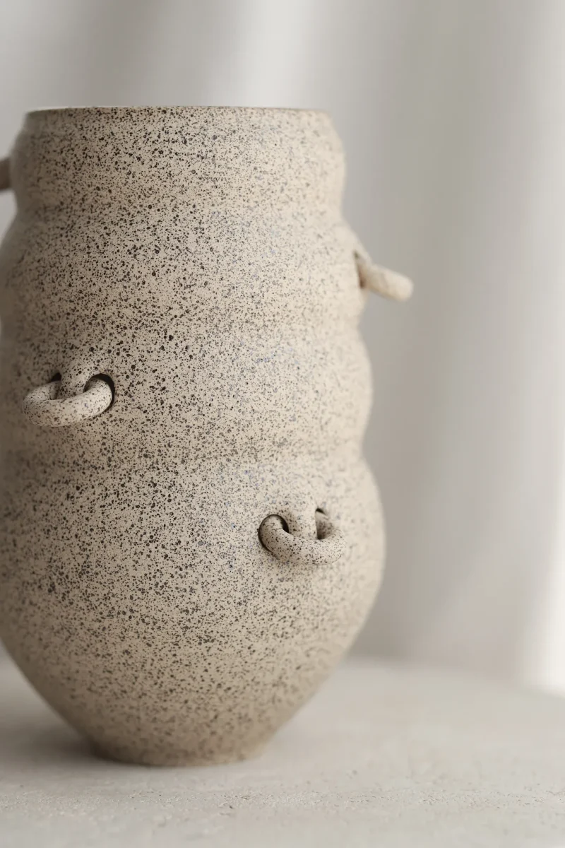 Hand-thrown curvy chain vase with a black speckled texture on a cream finish. This piece has gone through the creative process of being hand thrown, hand-sculpted, trimmed, fired in a kiln, glazed, and fired in a kiln once more. The chains are crafted by hand and sealed for added protection. Due to the nature of handmade ceramics, each piece is unique and there may be small imperfections.