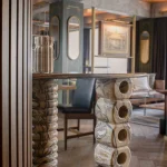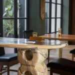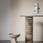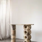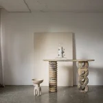 The organic-shaped bases of the console are inspired by Mexico’s iconic solid candies, such as Tornillo and Faros, whose distinctive forms serve as the foundation for this design. The rich textures and colors of these traditional sweets informed the material selection, with marble and onyx carefully chosen to translate their vibrant, playful essence into a refined and timeless composition.