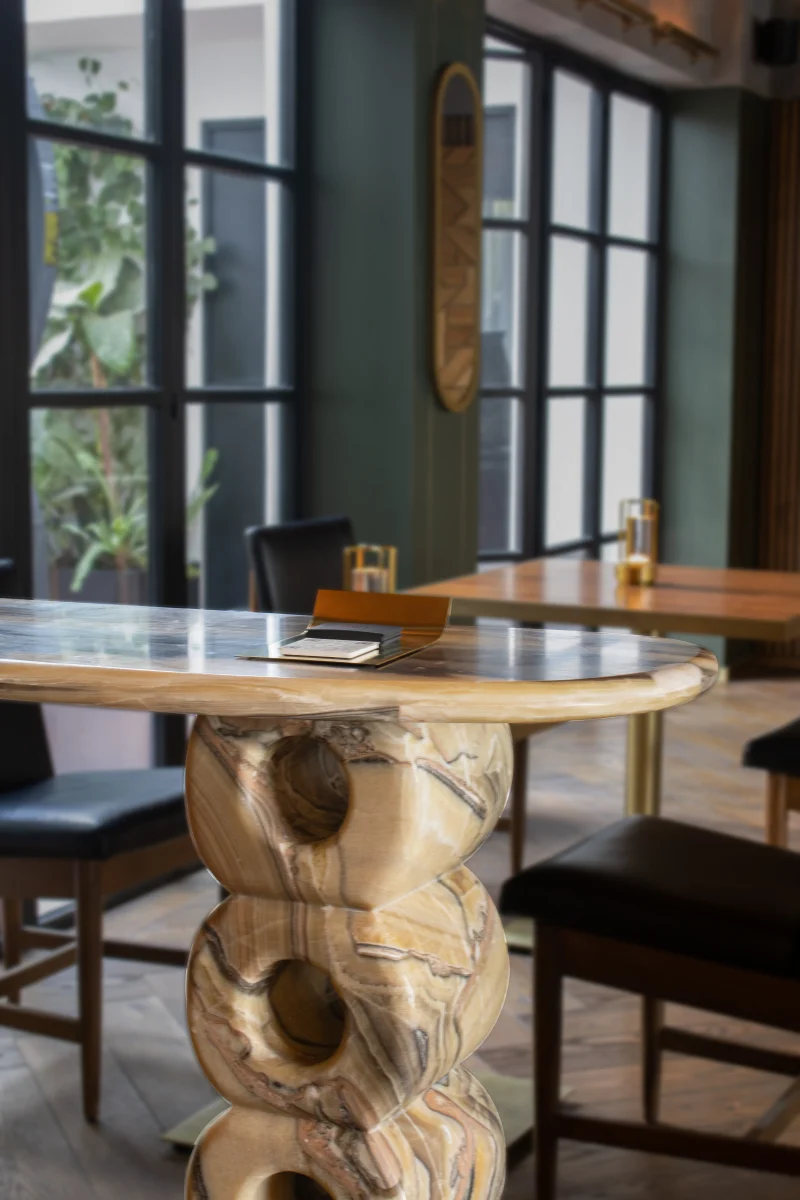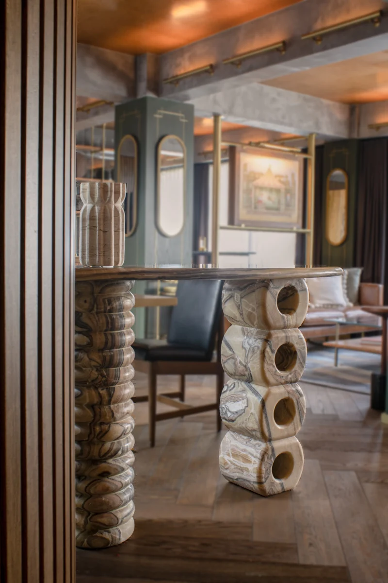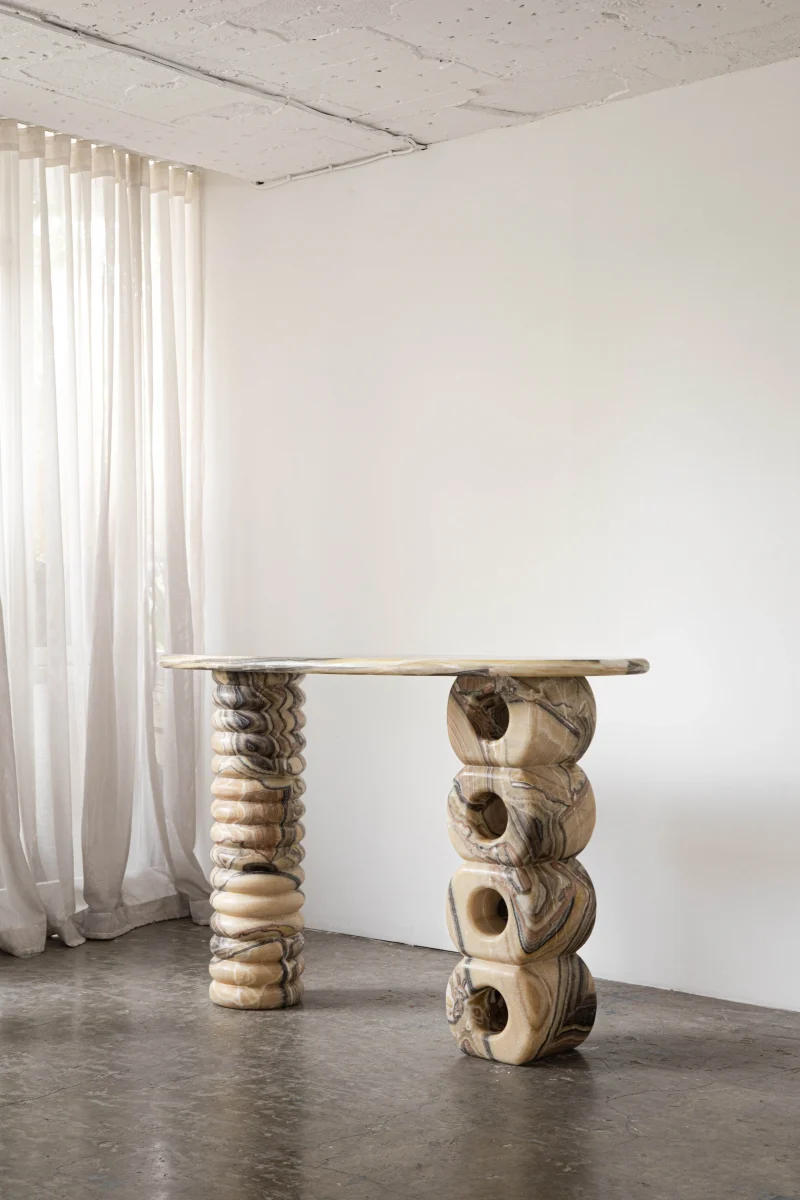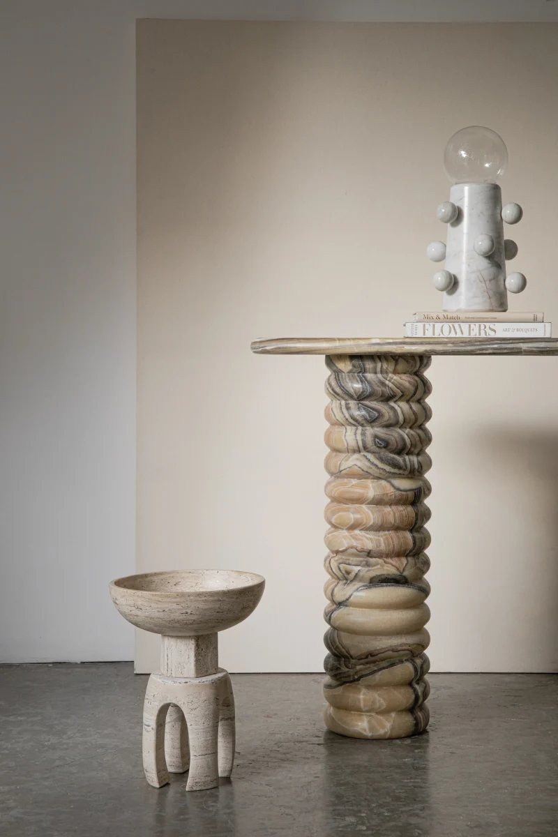 The organic-shaped bases of the console are inspired by Mexico’s iconic solid candies, such as Tornillo and Faros, whose distinctive forms serve as the foundation for this design. The rich textures and colors of these traditional sweets informed the material selection, with marble and onyx carefully chosen to translate their vibrant, playful essence into a refined and timeless composition.