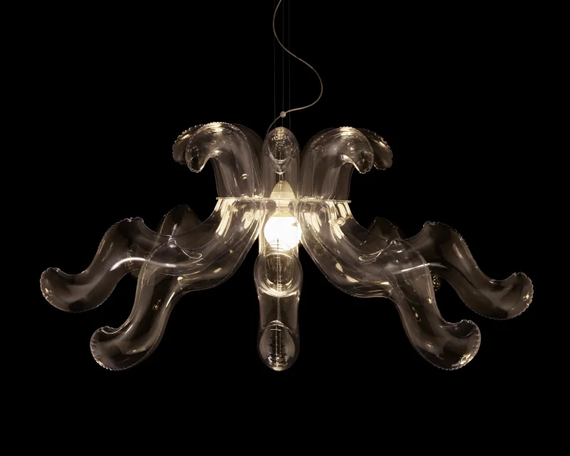 LULLABY by PUFF-BUFF is an unusual and spectacular chandelier, different from other lamps. Inspired by baroque forms and murano glass but made in an inflatable technology. Eight air-filled arms give the appearance of glass while being flexible and really featherweight! This transparent, decorative lamp, combines beauty with a touch of irony. There are beautiful details on the edges of the lamp resulting from its inflatable nature. The arms can be placed in three different ways to make three possible lamp forms and sizes. The lamp is made of high-quality soft PVC (made in Germany) with UV filter so it remains crystal-clear. Transparent acrylic construction is nearly invisible.