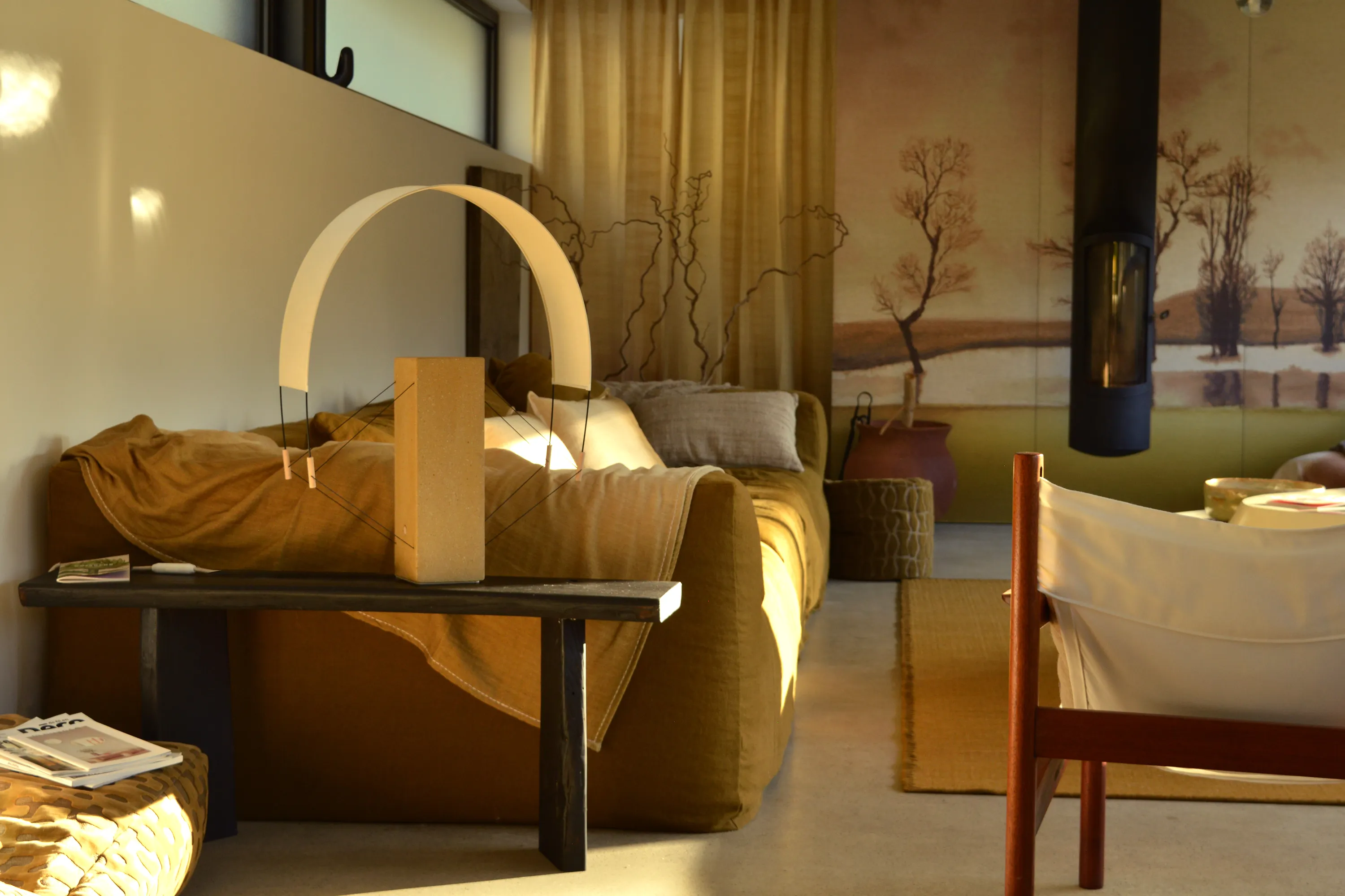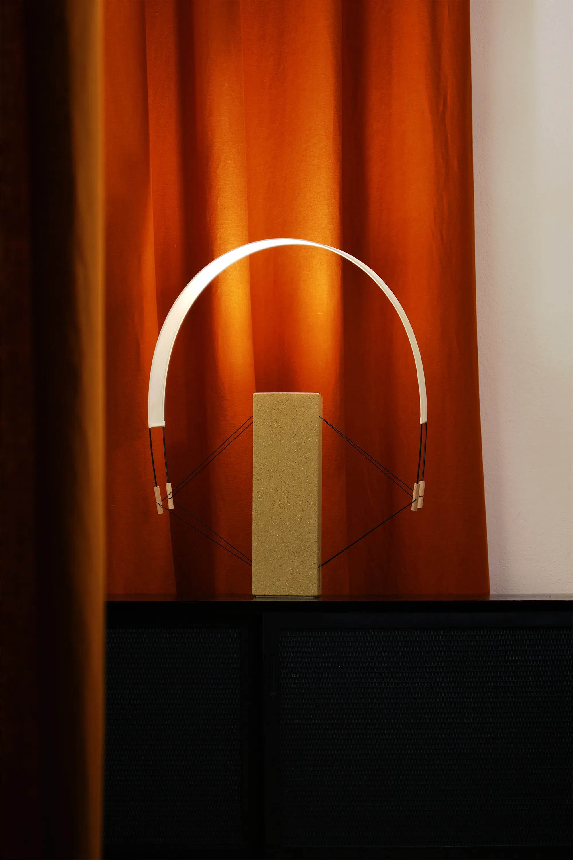Inspired by the luminous beauty of the Mediterranean, Lumia reveals its dual nature: a sculptural monolith by day, a bright halo at night. Its warm, diffused glow—like the first rays of a sunrise—transforms any space into a soft and evocative atmosphere.