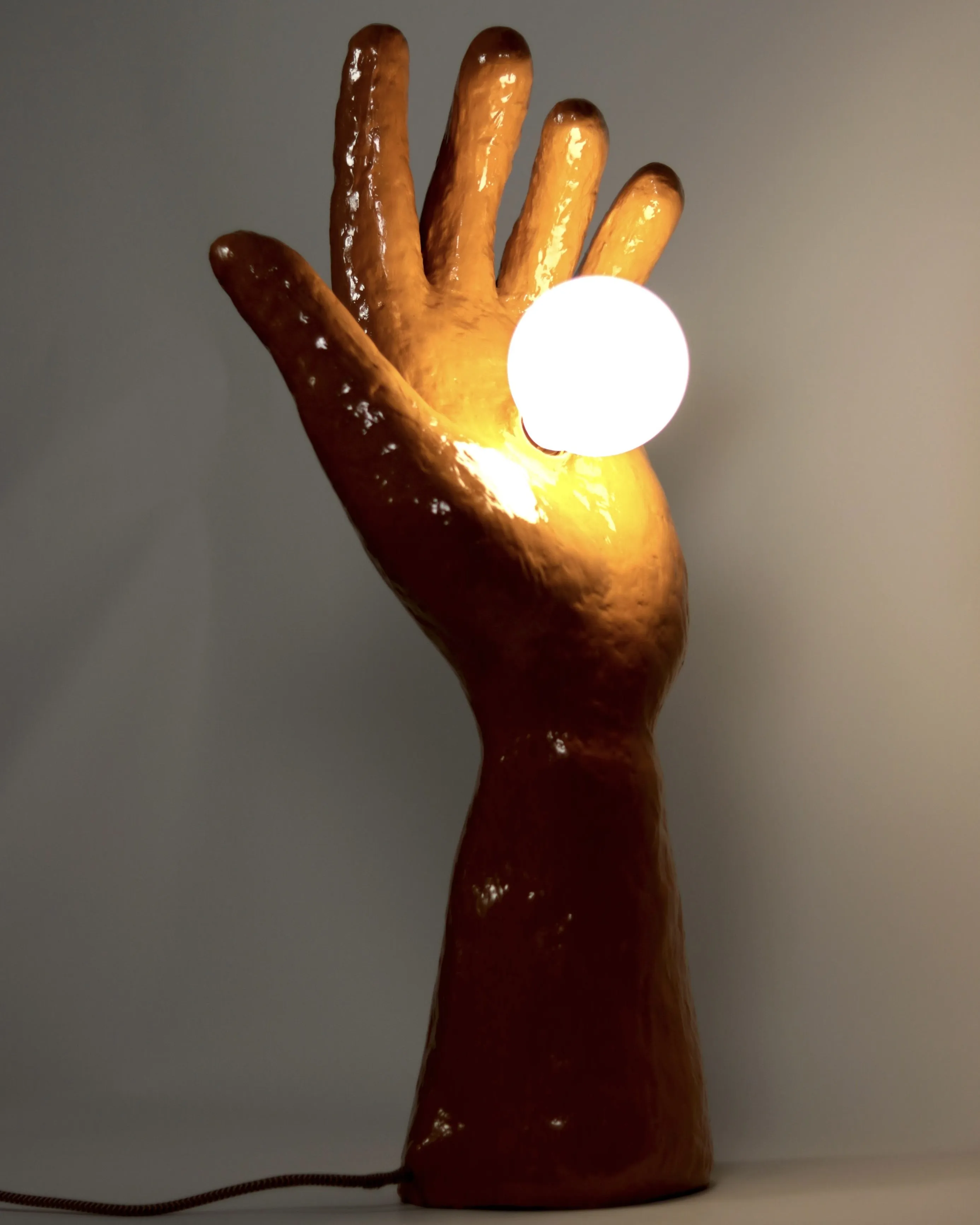Hand-sculpted in papier-mâché, this lamp transforms the symbolic gesture of a hand into an object of light and affection.