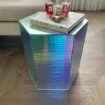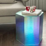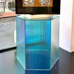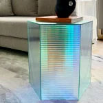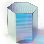 ‘Luminous’ is entirely made by ribbed glass, featuring a captivating iridescent, multi-colored design. When light passes through, it reveals a dazzling array of colors that gracefully dance with the changing perspectives of its surroundings. Designed with purposeful versatility, Luminous seamlessly transitions into your space as a coffee table or nightstand, introducing a touch of maximalist magic to your living areas. Place it in a spot bathed in natural light and relish in the comforting warmth of its radiant glow.