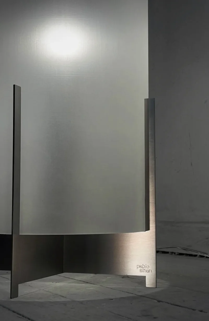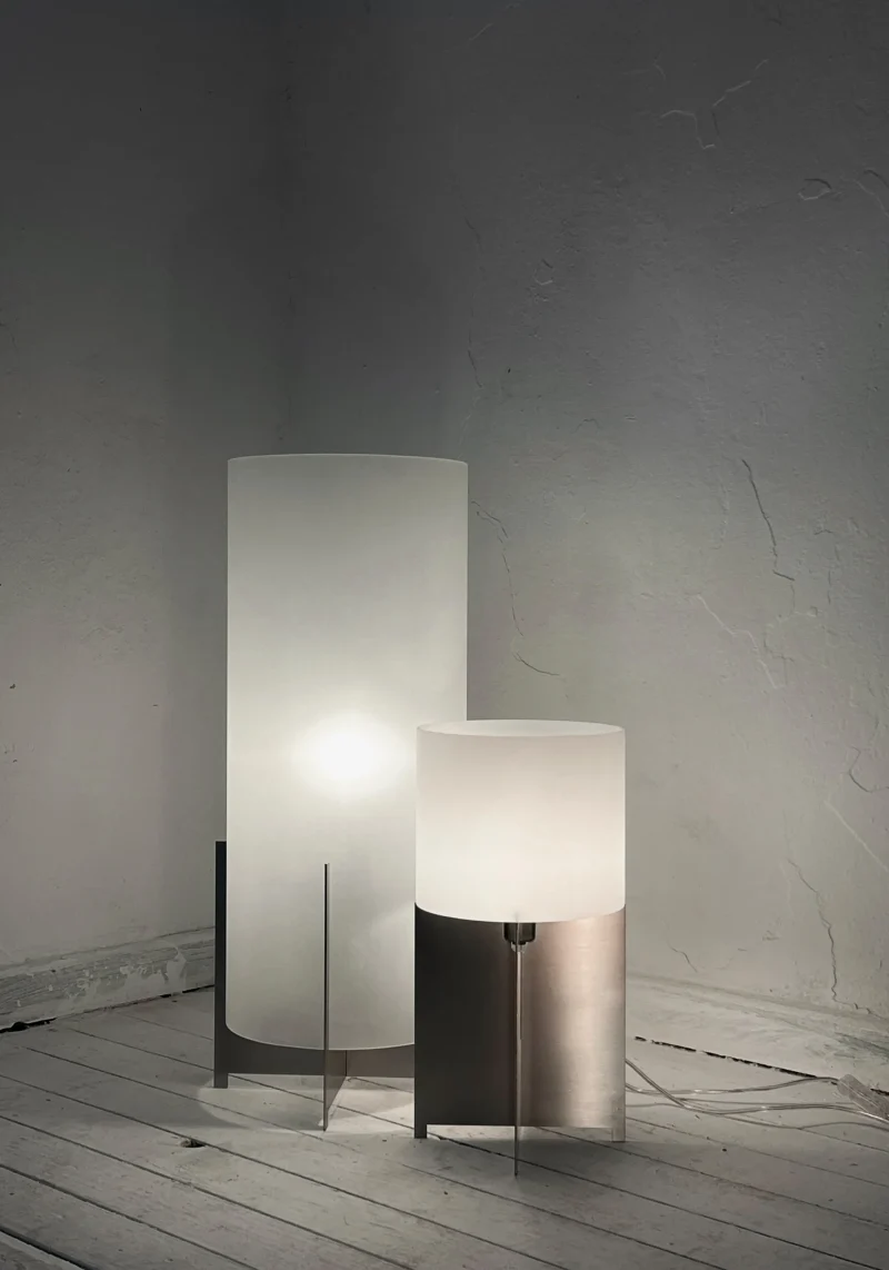 The most striking part of the design is the interlocking base consisting of two laser-cut stainless-steel legs with a hand-polished finish by master craftsmen. This gives the lamp a stable and solid base, with an elegant look. The lampshade is made of a polycarbonate cylinder, a 100% recyclable material, which projects a beautiful light when the lamp is on.