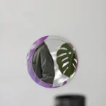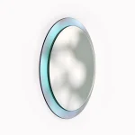 ‘Luna’ round mirror, sized at 35 centimeters in diameter, presents a captivating halo light that varies with the angle of incoming light, achieved through the use of iridescent glass in its design. Luna’s mesmerizing color-changing shimmer imparts luminous, art deco,  charm to your living spaces.