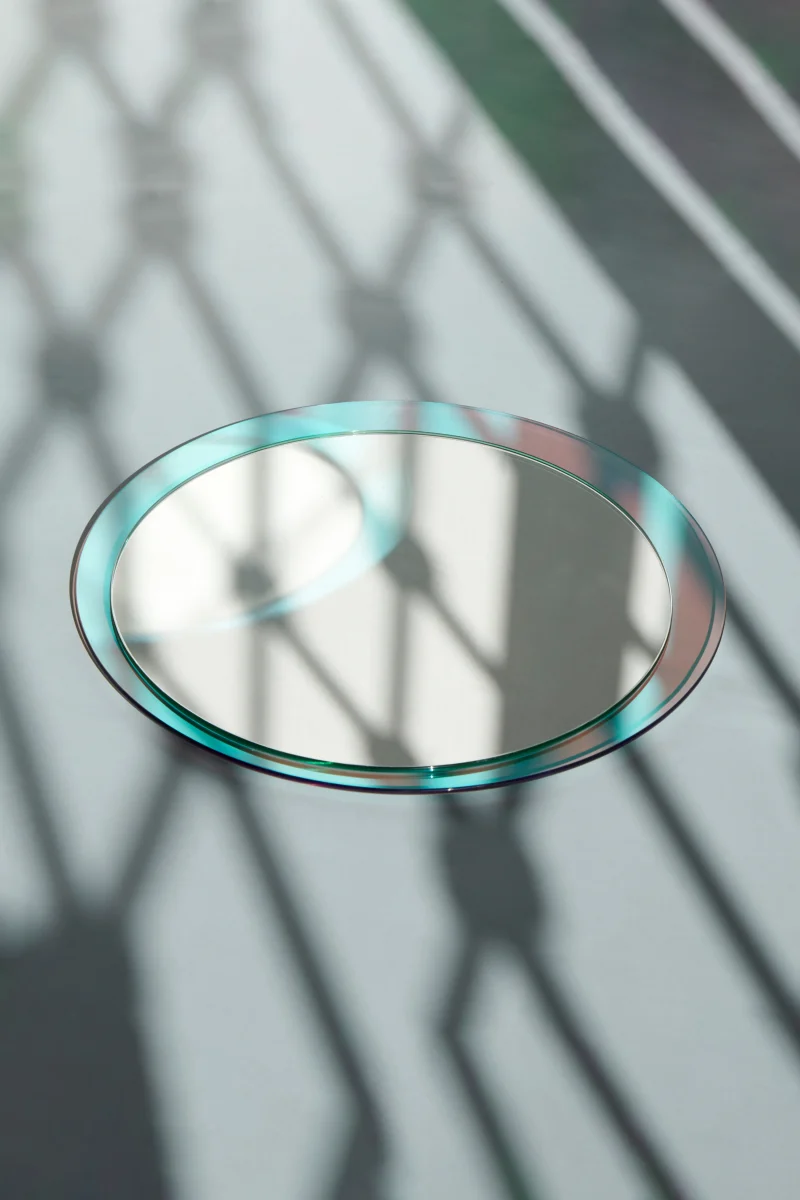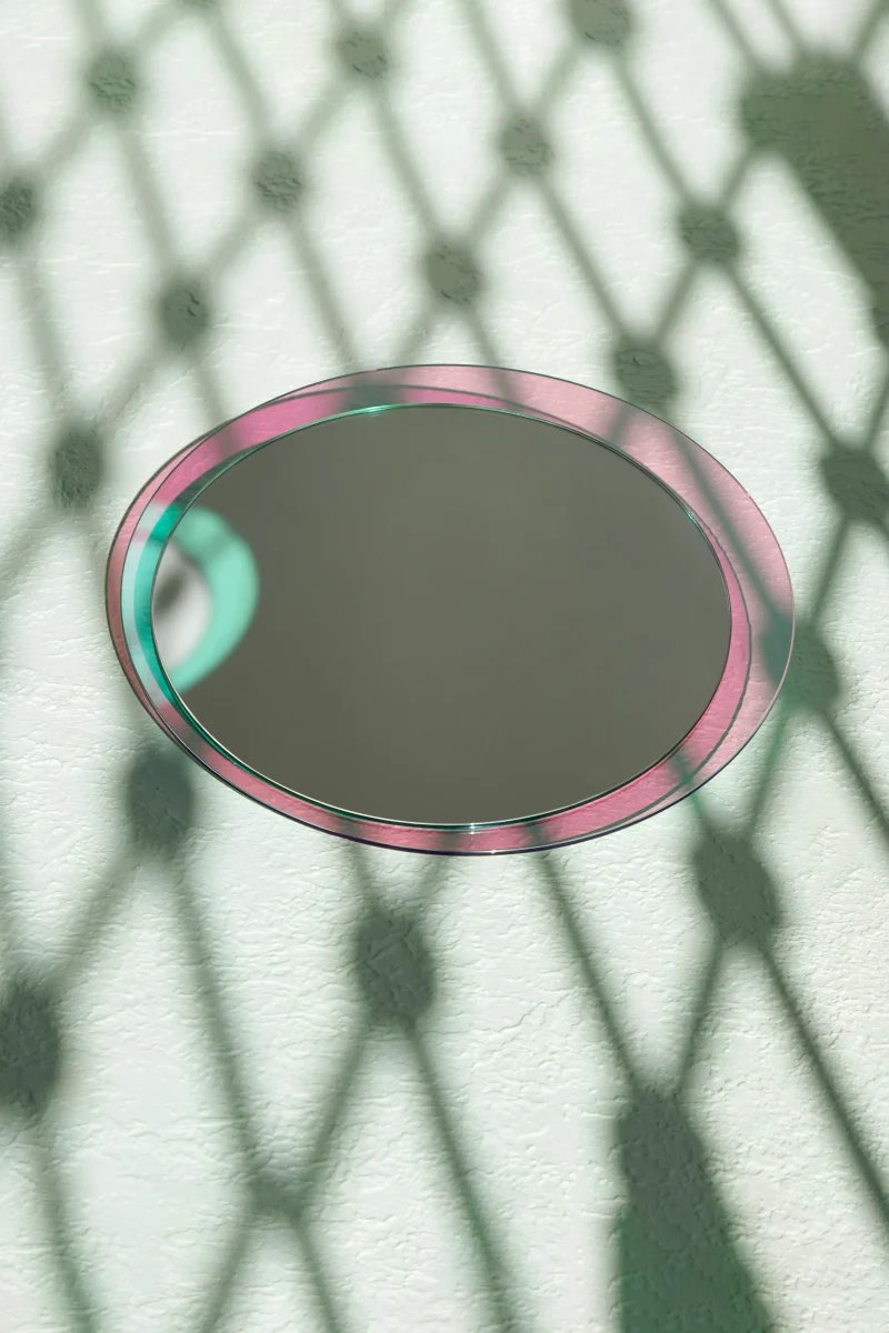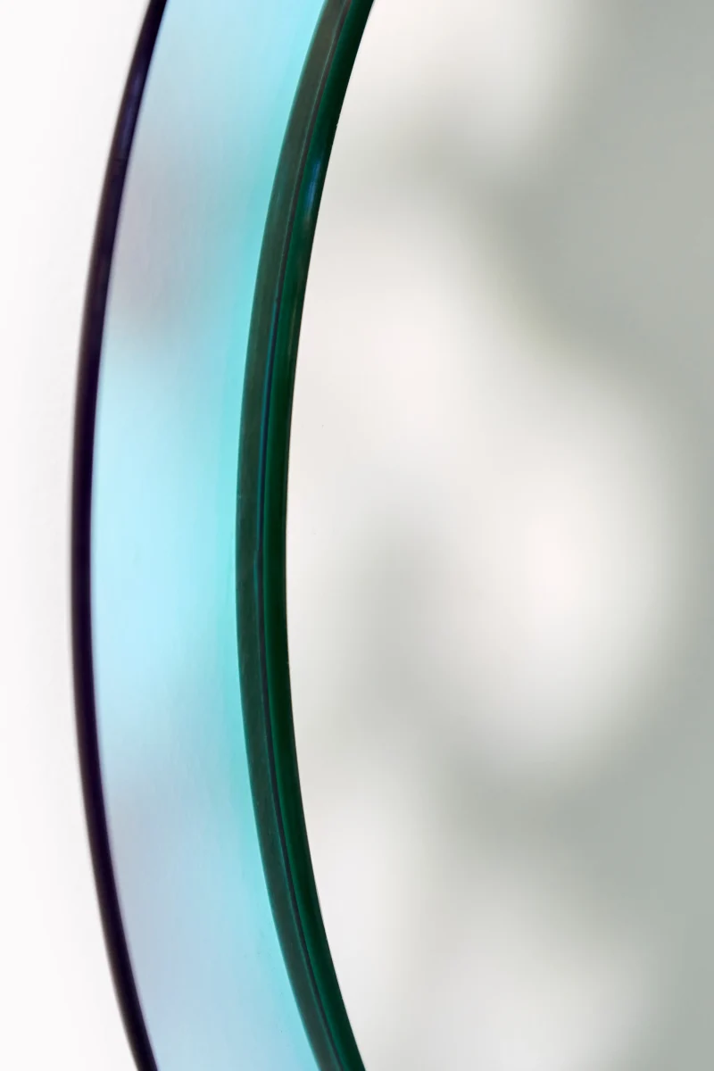 ‘Luna’ round mirror, sized at 35 centimeters in diameter, presents a captivating halo light that varies with the angle of incoming light, achieved through the use of iridescent glass in its design. Luna’s mesmerizing color-changing shimmer imparts luminous, art deco,  charm to your living spaces.