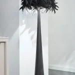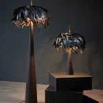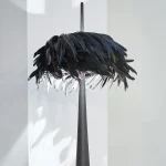 is a floor light made from dark iridescent green rooster tail feathers. The name refers to the new moon — a moment when light is momentarily obscured, yet beginning to emerge once more.