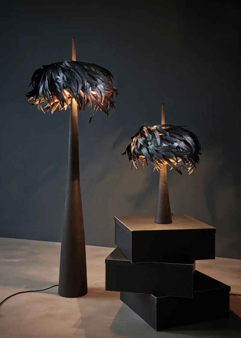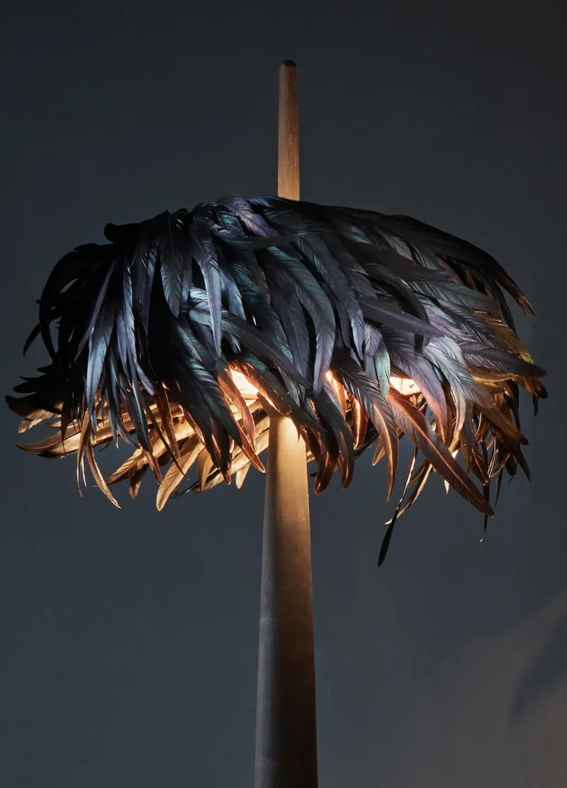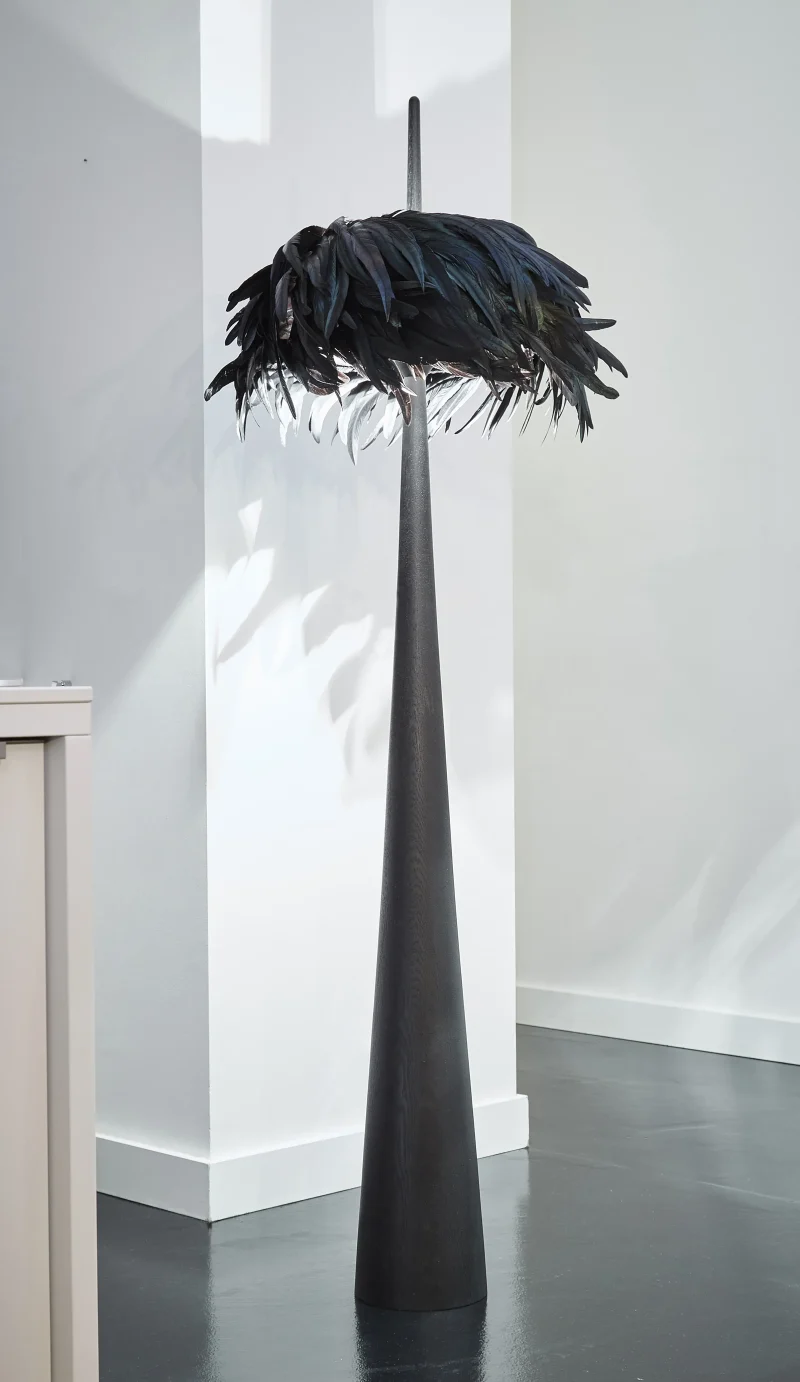 is a floor light made from dark iridescent green rooster tail feathers. The name refers to the new moon — a moment when light is momentarily obscured, yet beginning to emerge once more.