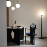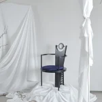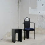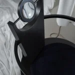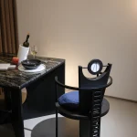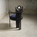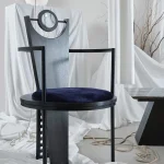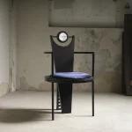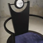 Its most distinctive features are the sculptural backrest and the marble detail at the top, which incorporates an eye-catching circular cutout with a polished surface, lending the piece a sense of mystery and sophistication. With its unique architectural form, this chair is not just a functional seating piece but also a hybrid design that merges modernist, industrial, and postmodern influences, making it ideal for interiors that appreciate bold creativity and avant-garde aesthetics.