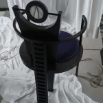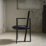 This striking chair is a perfect blend of contemporary design and artistic craftsmanship. Featuring a bold geometric structure, it combines sleek black metal with black wood, creating a balance of industrial and modern aesthetics. The circular seat is complemented by a plush, deep blue velvet cushion, adding both comfort and a touch of elegance.