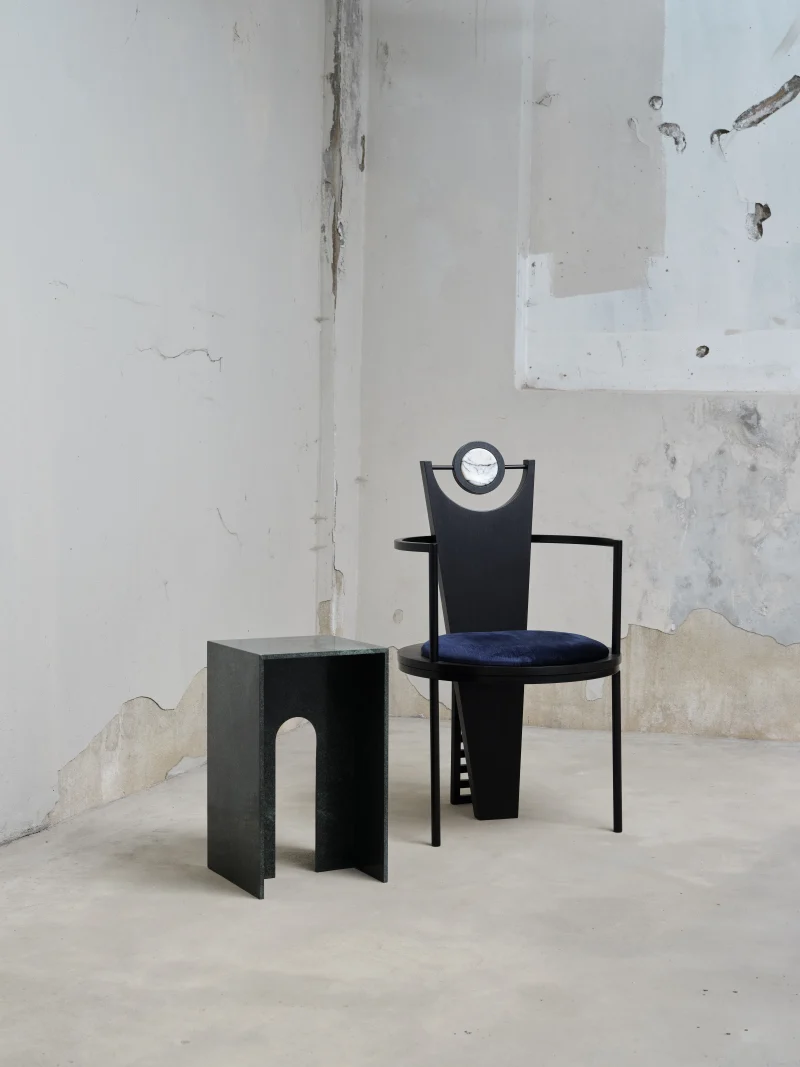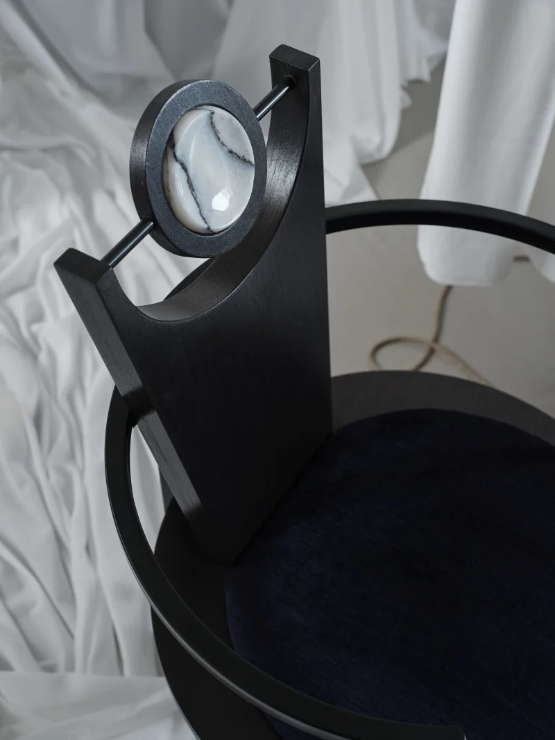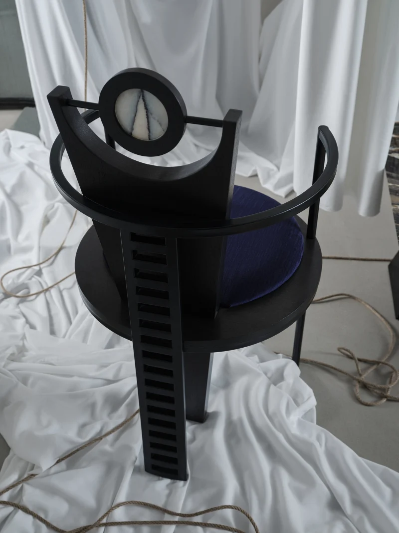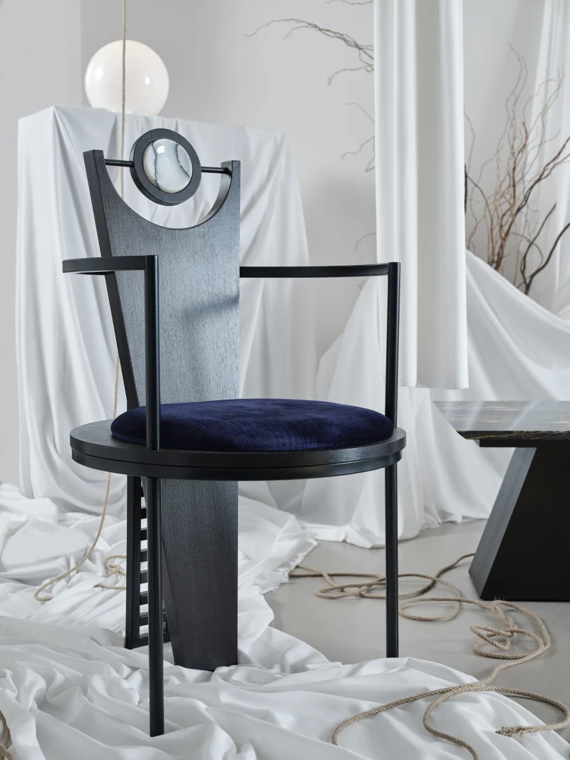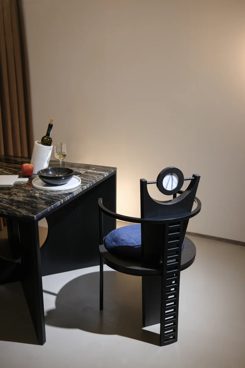 Its most distinctive features are the sculptural backrest and the marble detail at the top, which incorporates an eye-catching circular cutout with a polished surface, lending the piece a sense of mystery and sophistication. With its unique architectural form, this chair is not just a functional seating piece but also a hybrid design that merges modernist, industrial, and postmodern influences, making it ideal for interiors that appreciate bold creativity and avant-garde aesthetics.