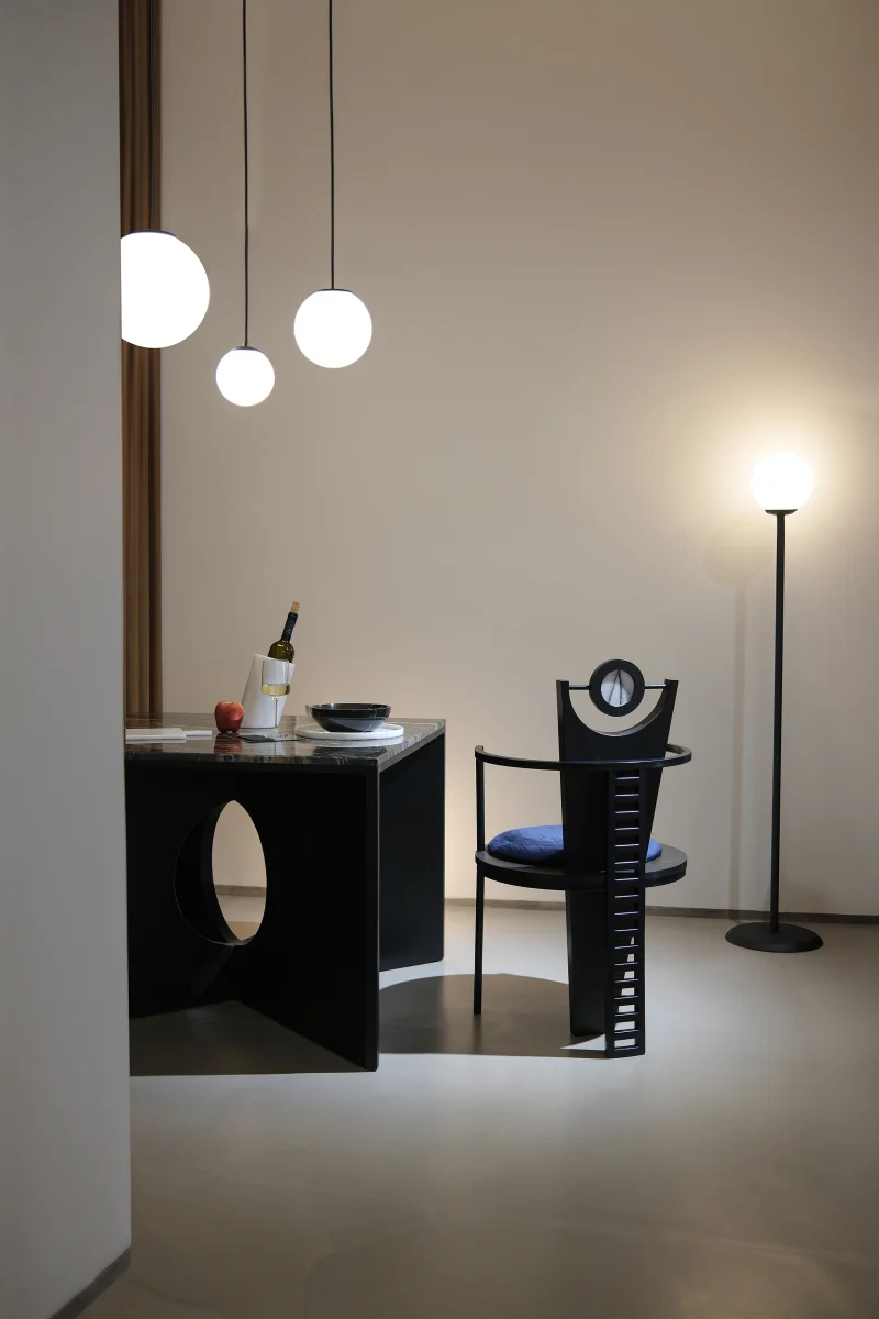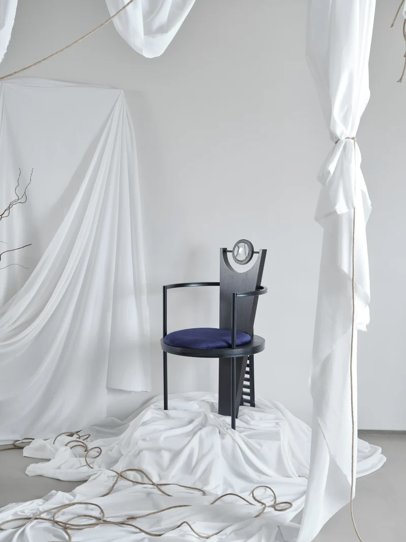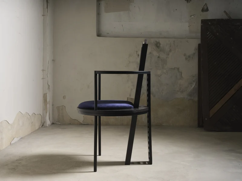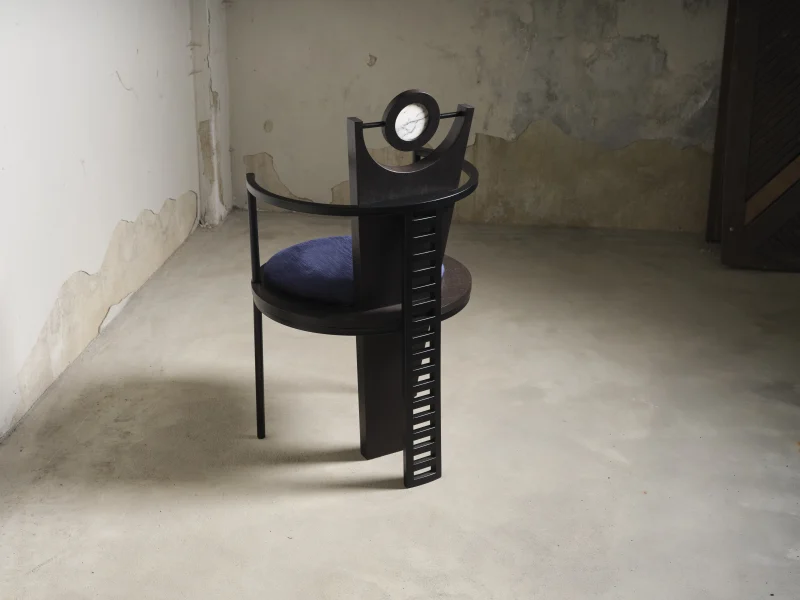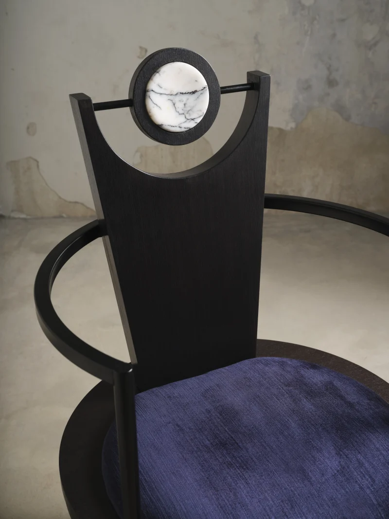 Its most distinctive features are the sculptural backrest and the marble detail at the top, which incorporates an eye-catching circular cutout with a polished surface, lending the piece a sense of mystery and sophistication. With its unique architectural form, this chair is not just a functional seating piece but also a hybrid design that merges modernist, industrial, and postmodern influences, making it ideal for interiors that appreciate bold creativity and avant-garde aesthetics.