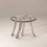 A larger and lower creation,its presence sturdier yet graceful, versatile enough to serve as a companion side table. Its wide, bending legs flow into an irregular form, where half-moon shapes