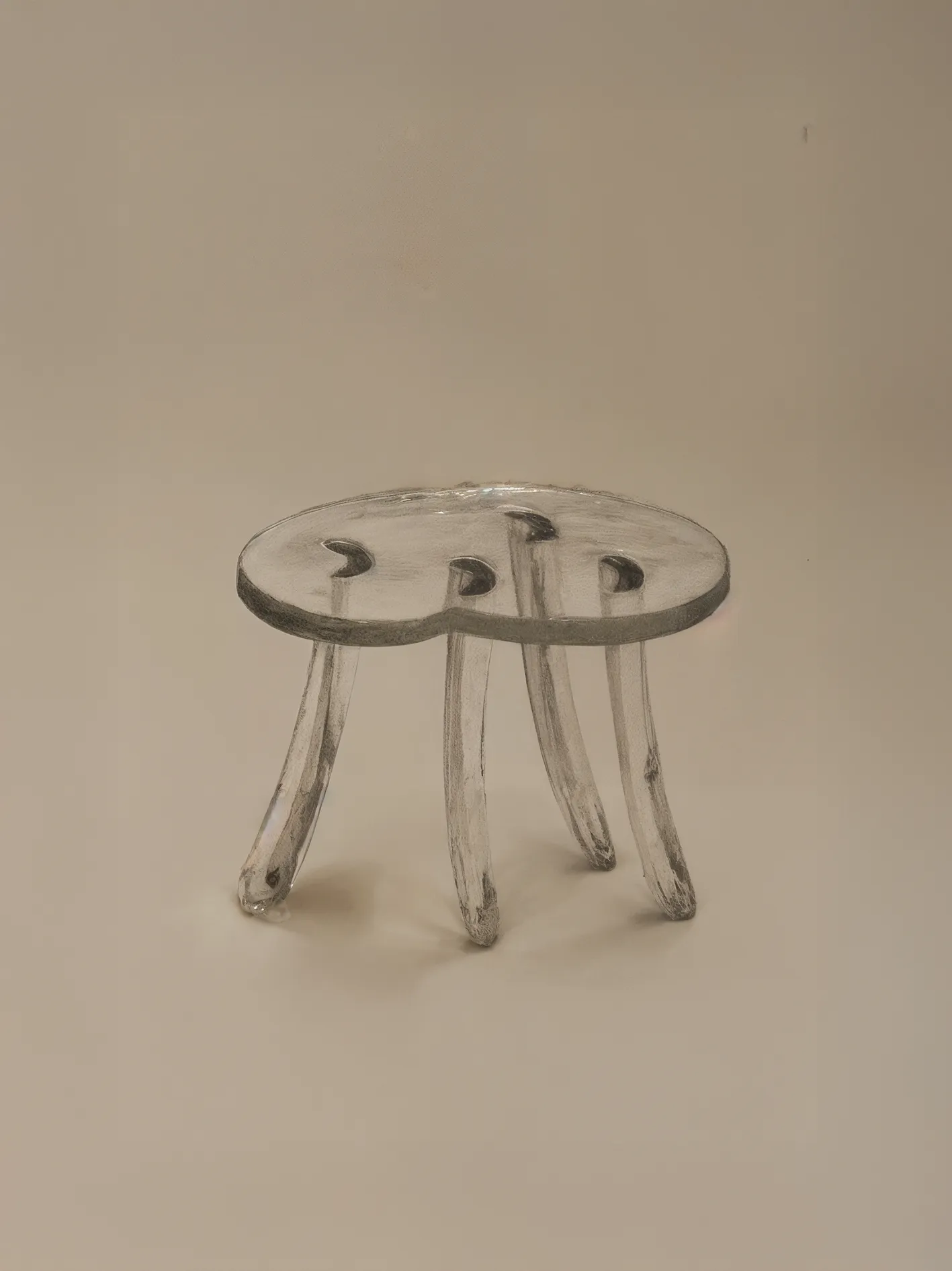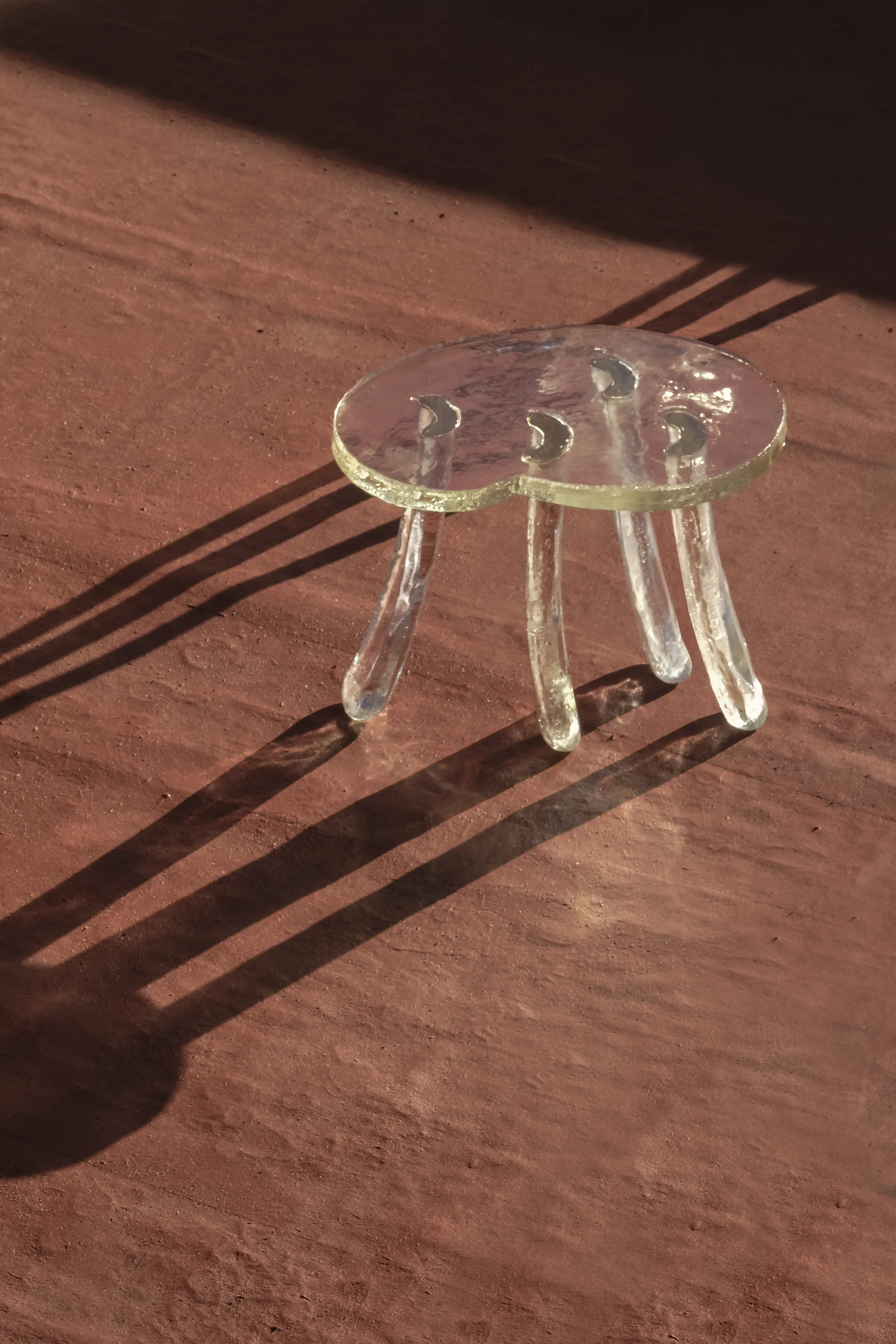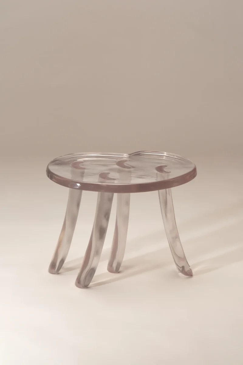 A larger and lower creation,its presence sturdier yet graceful, versatile enough to serve as a companion side table. Its wide, bending legs flow into an irregular form, where half-moon shapes
