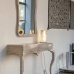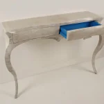 The LXV Console in bleached cherry mounts to the wall via a hidden cleat, and features two drawers with a bright blue painted finish.