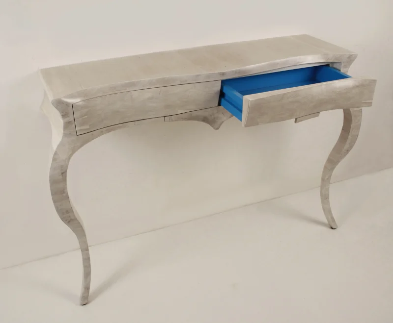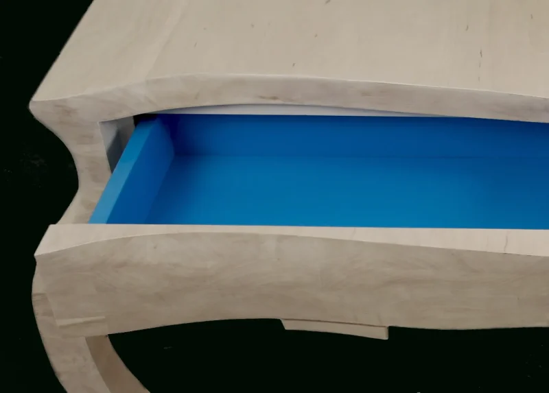 The LXV Console in bleached cherry mounts to the wall via a hidden cleat, and features two drawers with a bright blue painted finish.