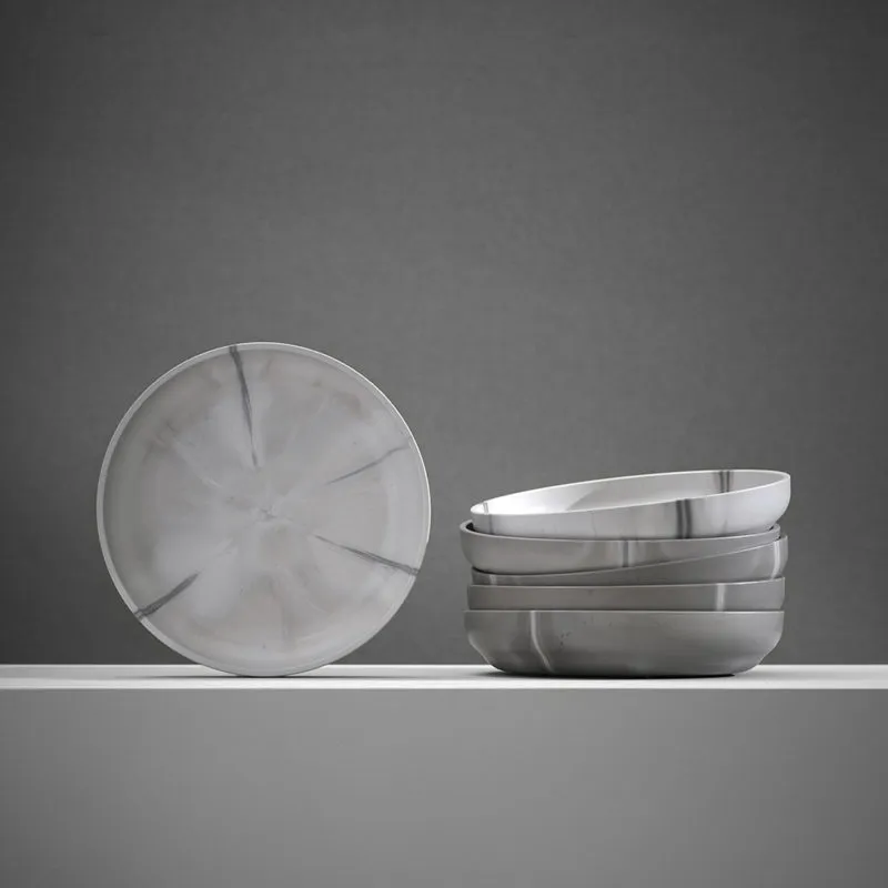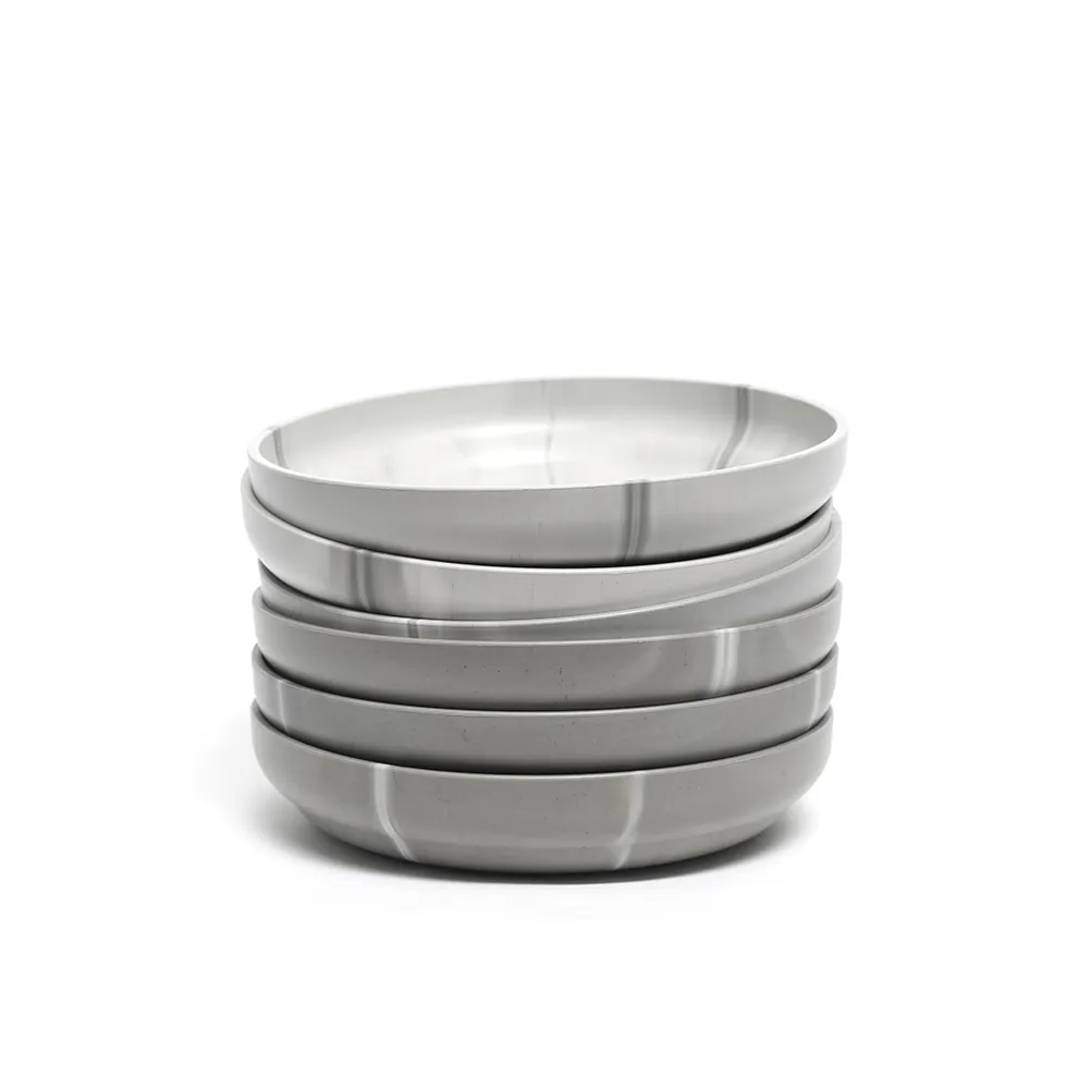ecoBirdy has developed a technique that allows the reclaimed plastic to be an integral part of the production process; its authentic characteristics organically form a vein-like pattern and create an earthy colour palette. Colour schemes and patterns follow a gradient progression, which produce a series of six soft tonal shades. The resulting tableware is a stylish embellishment to dining.