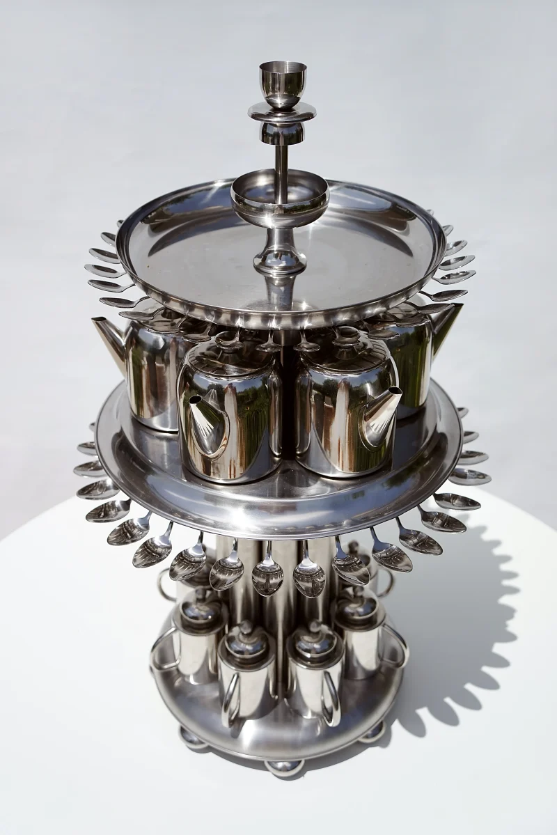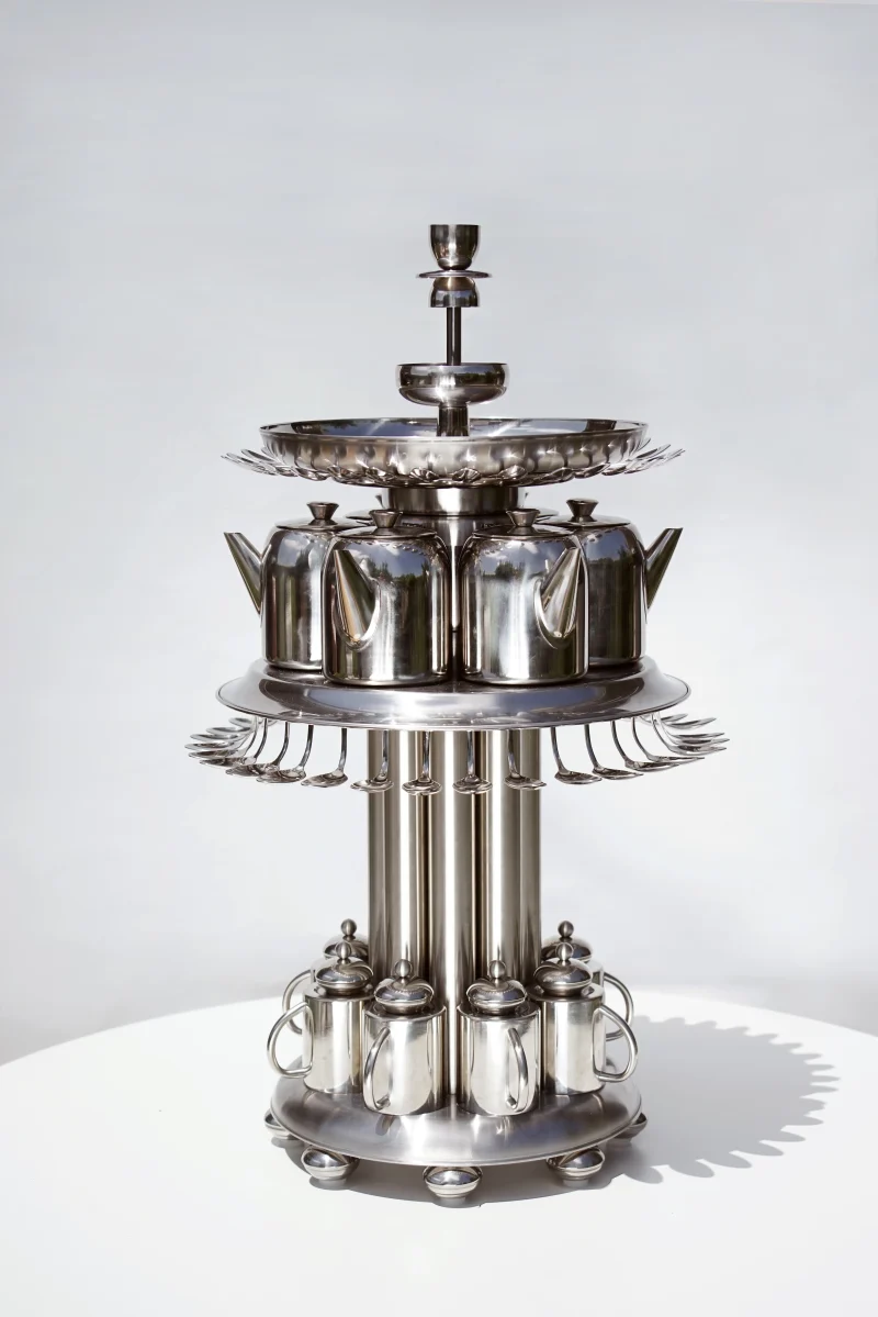 There are teapots and teaspoons, saucers and mugs, thermoses, and, of course, a tray on top to complete the composition. This tea-inspired madness is built in the proportions of a classical column and reminds us of the beloved scene from Alice in Wonderland – the Mad Tea Party.