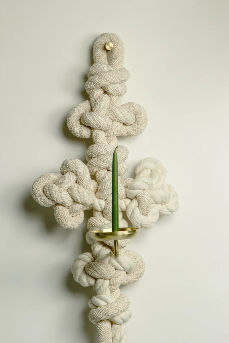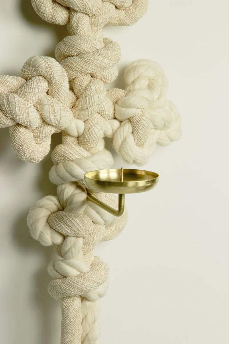 A candle sconce by WKND Lab constructed with cotton rope, viscose casing, and brass. The brass