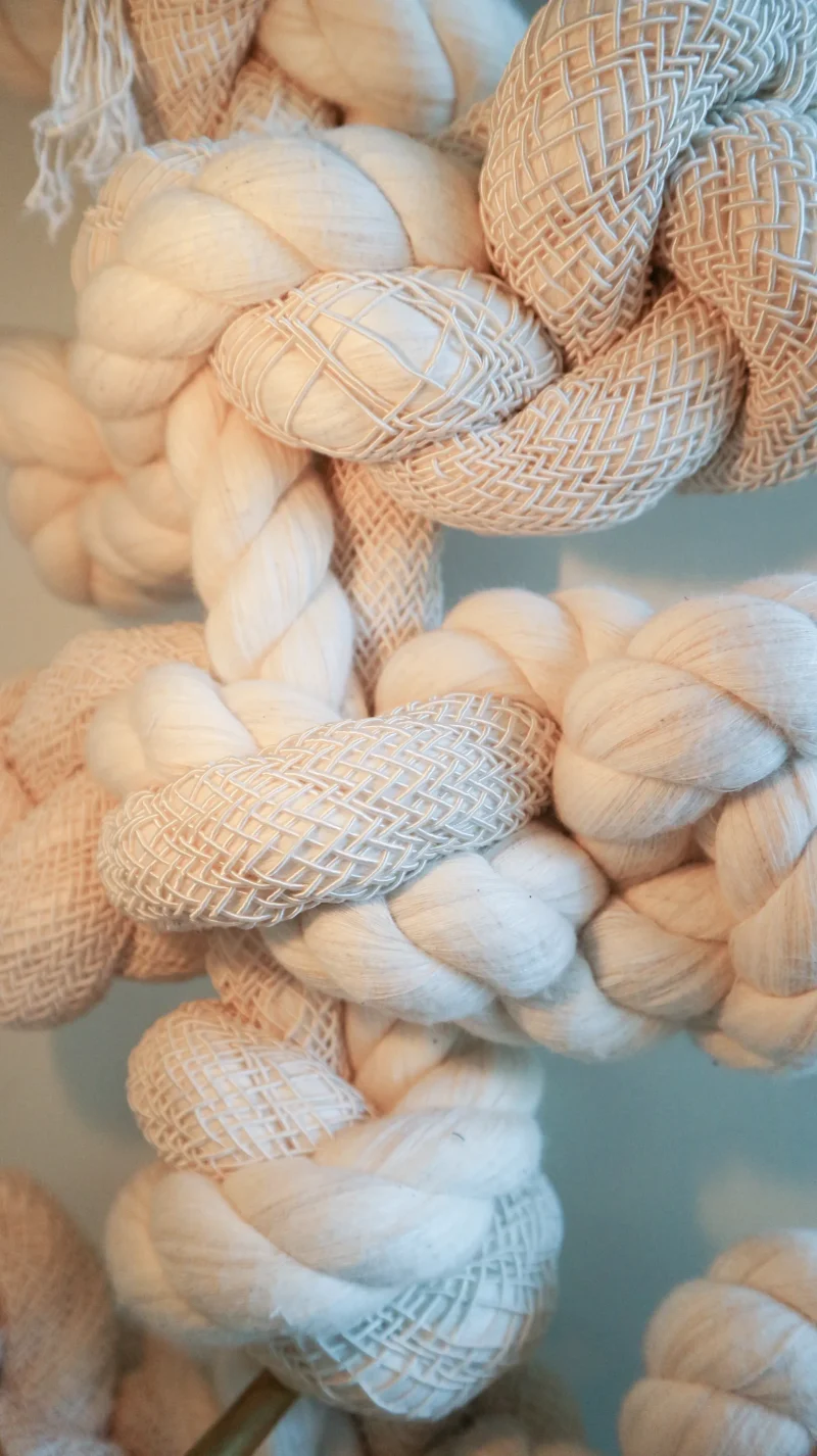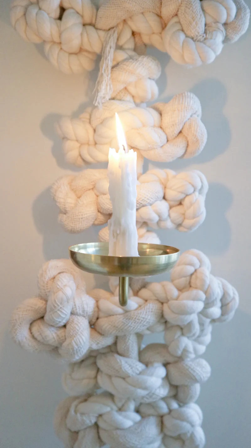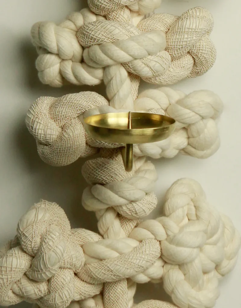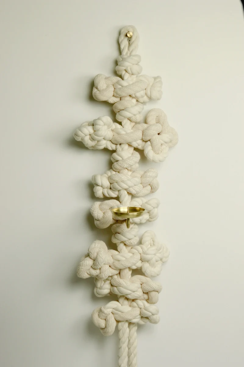 A candle sconce by WKND Lab constructed with cotton rope, viscose casing, and brass. The brass part is made by a metal turning master who worked as a technician for more than 45 years. The rope is developed especially for the piece by WKND Lab. The meaning behind it follows the same as the **Guidorae** and **Samjeongja** knot-making methods. Traditionally, the **Guidorae** symbolizes harmony and continuity, while the **Samjeongja** represents balance, strength, and stability. Together, these knots convey blessings of protection, connectedness, and well-being.