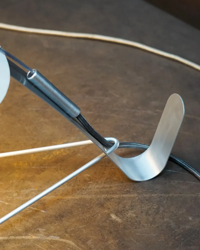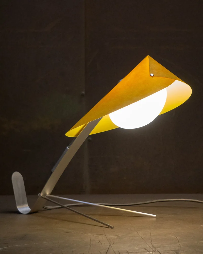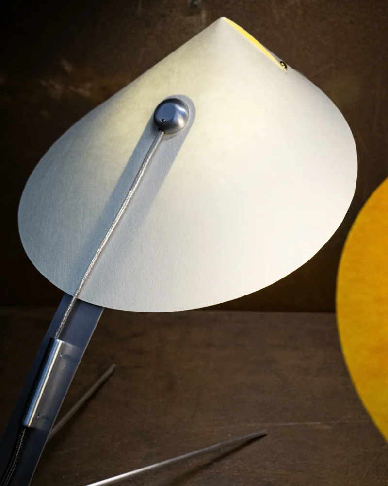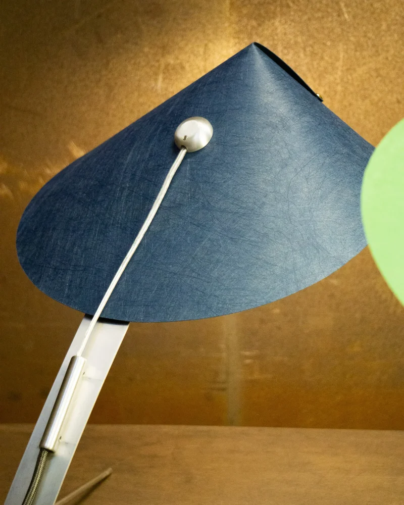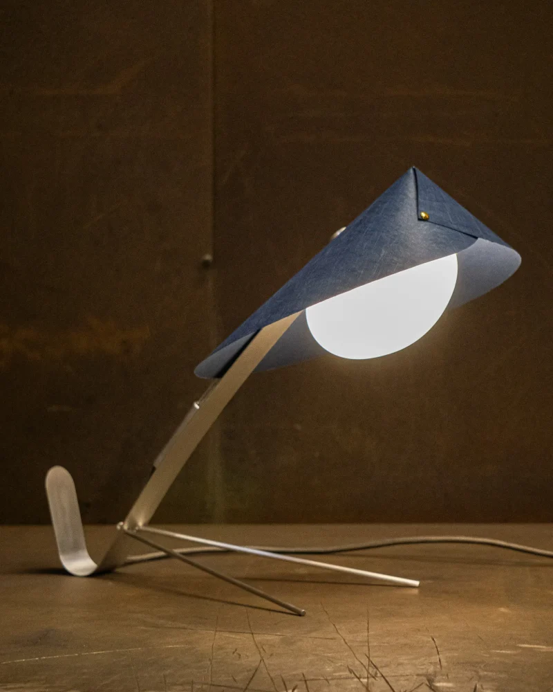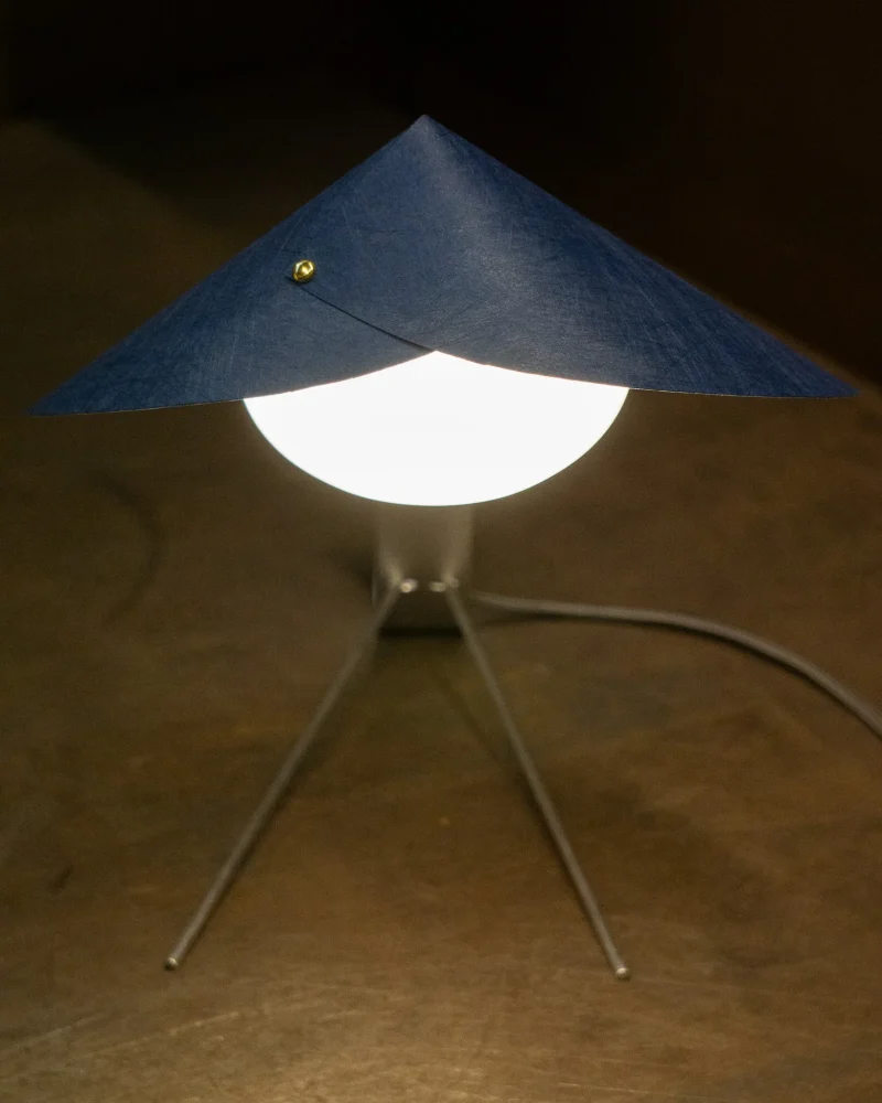 Poised, delicate and playful – the MANTIS Table Lamp is handcrafted at our North London-based workshop. The fixture boasts a unique paper type that blends paper and non-woven fabric. Visible on the surface are the very fibres that give this paper its distinctive character. Striking both visually and texturally, it also offers surprising versatility. When held to the light, the paper takes on a warm sheen. The paper shade, reminiscent of a mantis’s extended forelimbs, and the slender, curved arm, echoing the insect’s elongated body, create a harmonious and visually appealing silhouette when combined with the ellipsoid light source.