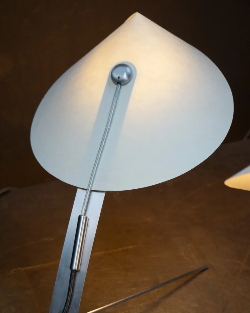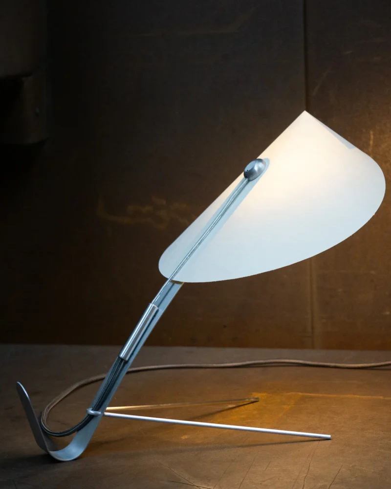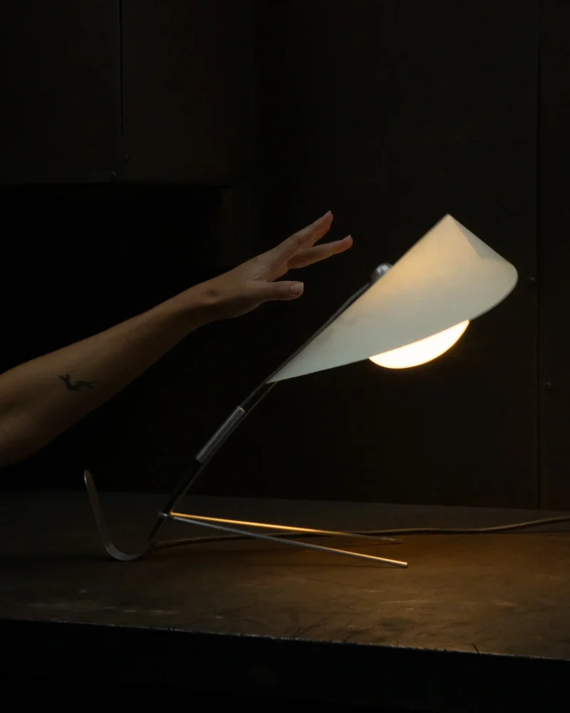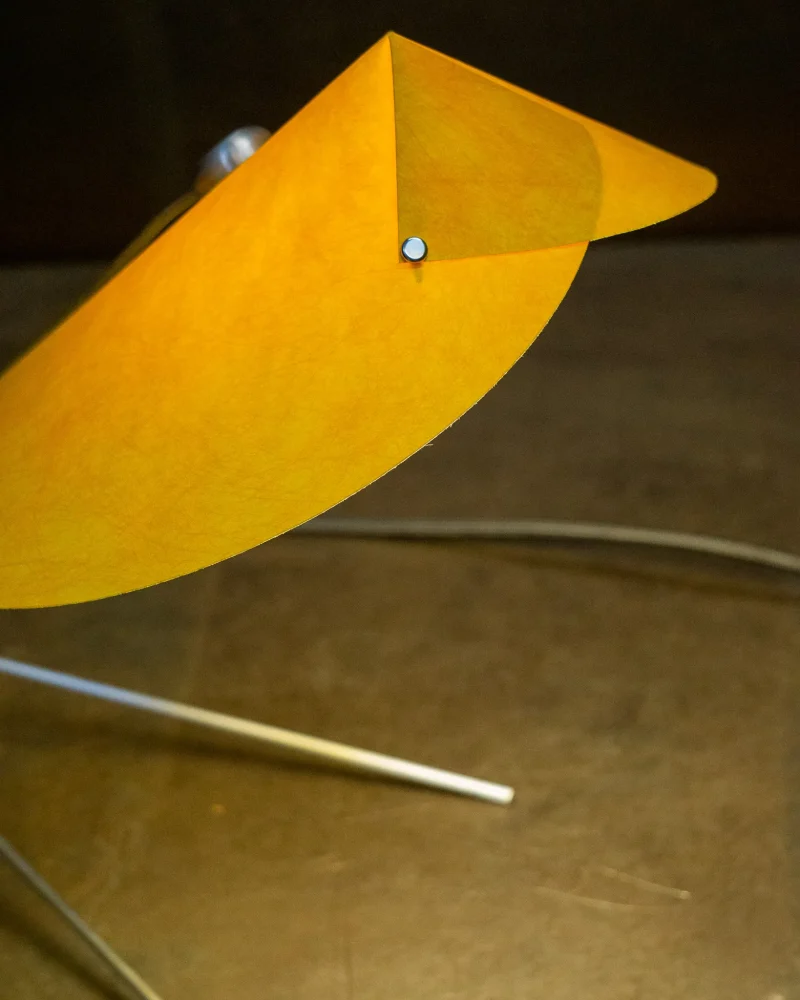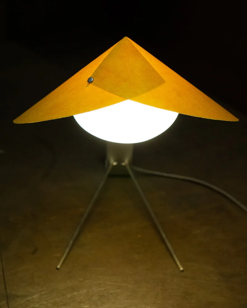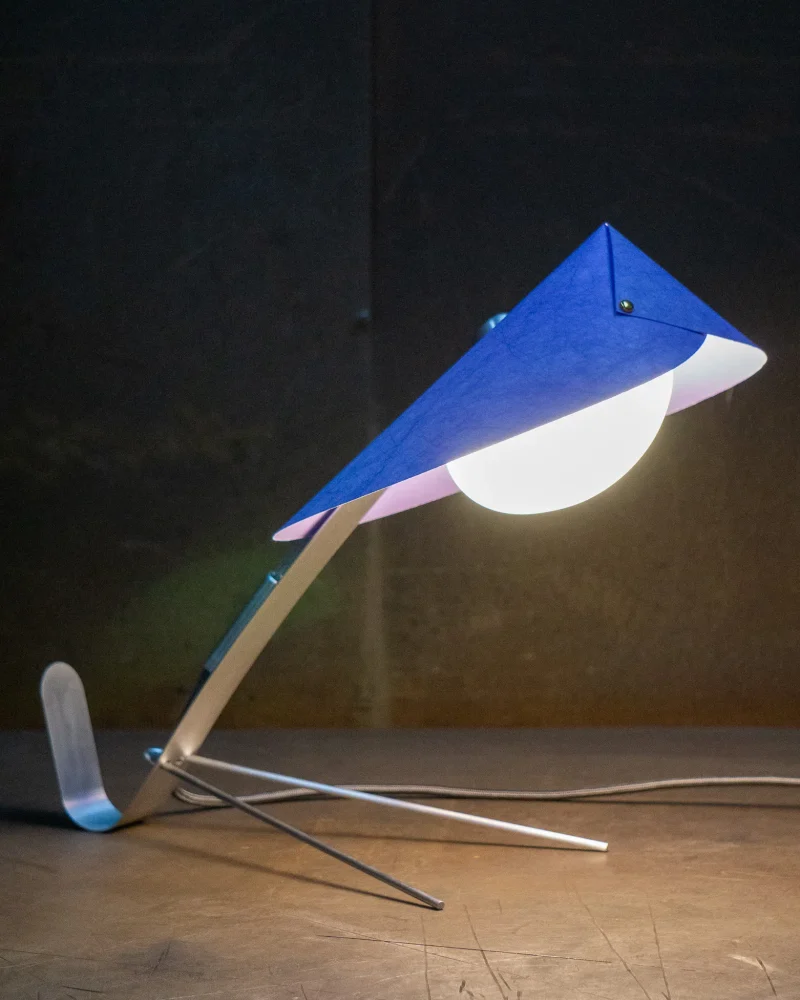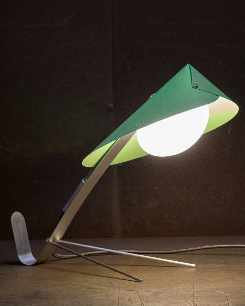Poised, delicate and playful – the MANTIS Table Lamp is handcrafted at our North London-based workshop. The fixture boasts a unique paper type that blends paper and non-woven fabric. Visible on the surface are the very fibres that give this paper its distinctive character. Striking both visually and texturally, it also offers surprising versatility. When held to the light, the paper takes on a warm sheen. The paper shade, reminiscent of a mantis’s extended forelimbs, and the slender, curved arm, echoing the insect’s elongated body, create a harmonious and visually appealing silhouette when combined with the ellipsoid light source.