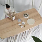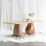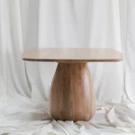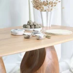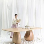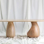 The Mar dining table by Ecuadorian design project, Laluz Handcraft, is an asymmetric sculptural piece meant to transmit grounding simplicity and softness, evoking a sense of soft minimalism. It features two central bases supporting its top, each hand-shaped to evoke the flow of nature and water within the Ecuadorian Rain Forest. Every edge is meticulously crafted to feel rounded and organic, invoking a sense of ease and tranquility while using it. The table’s wood, carefully selected from fair trade Gurango wood, exudes a Scandinavian modern aesthetic and coastal appeal, showcasing the natural colors of the wood in a beautiful dance of shapes and forms. Crafted by passionate Ecuadorian artisans, this dining table pushes the boundaries of wood as a material.”