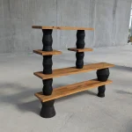 Mara, a modular shelving system crafted by French designer Guillaume Thireau, offers adaptability for any setting. Constructed entirely from oak, it features structural elements inspired by traditional carpentry techniques, where intertwining oak sections create a unified entity akin to the base of a roof. Infused with rustic design elements and a touch of Mid Century Modern style, Mara’s structural and sculptural components are meticulously crafted on a wood lathe. Their rich, dark hue is achieved through a chemical reaction with a rust-based solution, enhancing the oak’s natural tannins and adding depth to its surface.