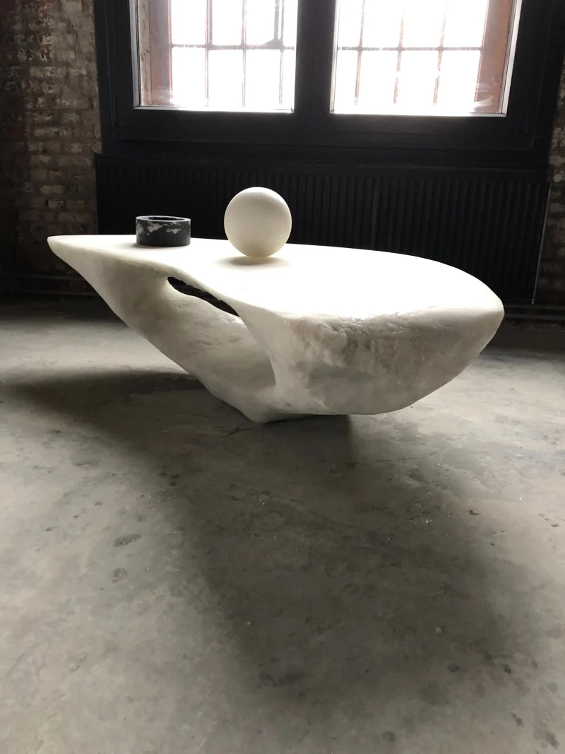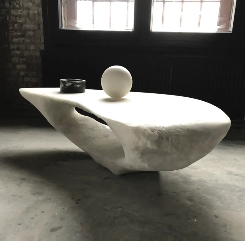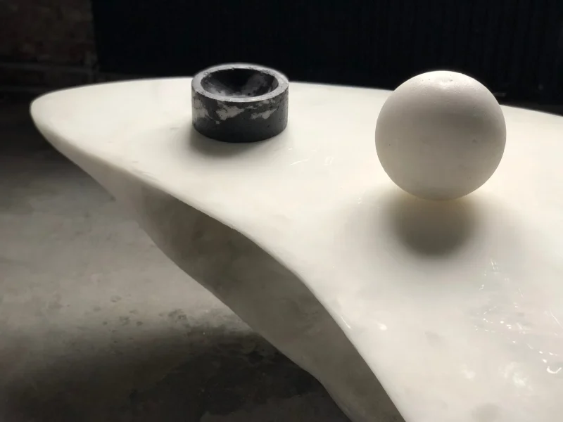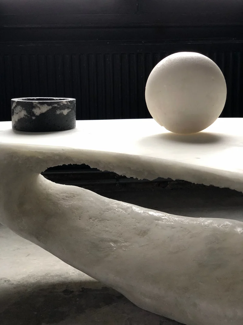 In ancient times, salt was rare and costly. Yet, since the industrial revolution, it has become so cheap and easily available that we no longer recognise its value. With “Marbled Salts”, Roxane Lahidji explores new possibilities, reinventing salt as a sustainable design material. She has made use of its unique physical properties as a self-binding composite to create a set of tables and stools. By mixing it with tree resin, she gives it shape and strength. Coal powder and the natural colour variations in salt mimic the aesthetics of expensive natural stone such as marble. Herein, she draws a contradictory parallel between the flexible versatility of salt and the material language of heavy and solid rock.