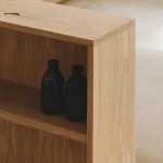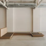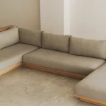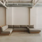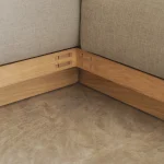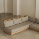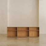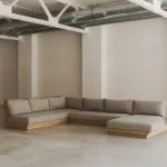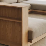 This large-format sofa by Mike Hausmann is designed for spacious interiors that seek simplicity in harmony with minimalism. It is crafted from French oak wood, featuring through mortise and tenon joints reinforced with wedges, and a recessed plinth to prevent shoes from scuffing when sitting down.