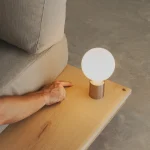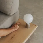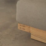 The upholstery is made from washable grey cotton fabric. The sofa also incorporates a light bulb with an embedded switch set into the wood, as well as a shelving unit on one of its sides.