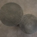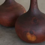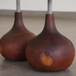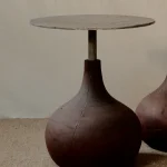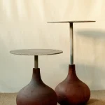 These set of two side tables blend traditional craftsmanship with modern design. The base, sculpted from a single block of wood using lathe techniques, features an onion-like shape inspired by domed finials in Islamic, Buddhist, and Indian architecture, symbolizing harmony and grandeur. The natural circular wood grains enhance the flowing design, showcasing the material’s raw beauty.