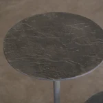 A textured aluminium plate with a creased fabric pattern forms the top, adding a soft, contemporary touch that contrasts the organic warmth of the wood. This combination of elements strikes a balance between tradition and modernity, creating functional yet artistic furniture pieces.