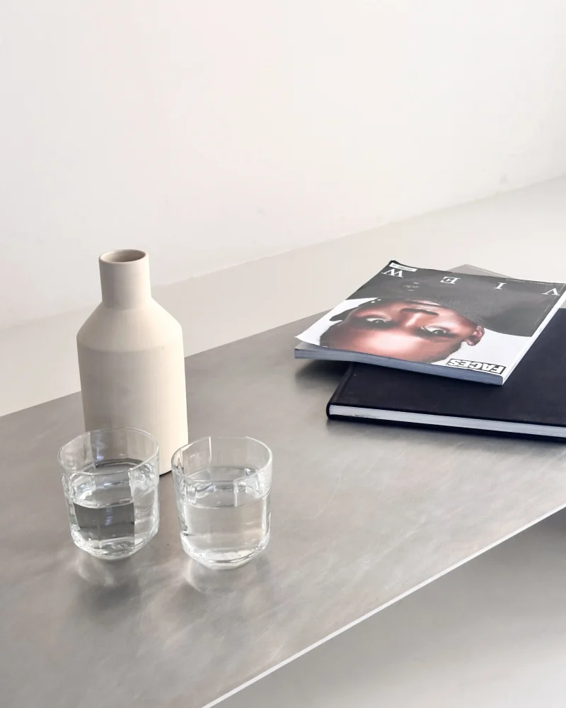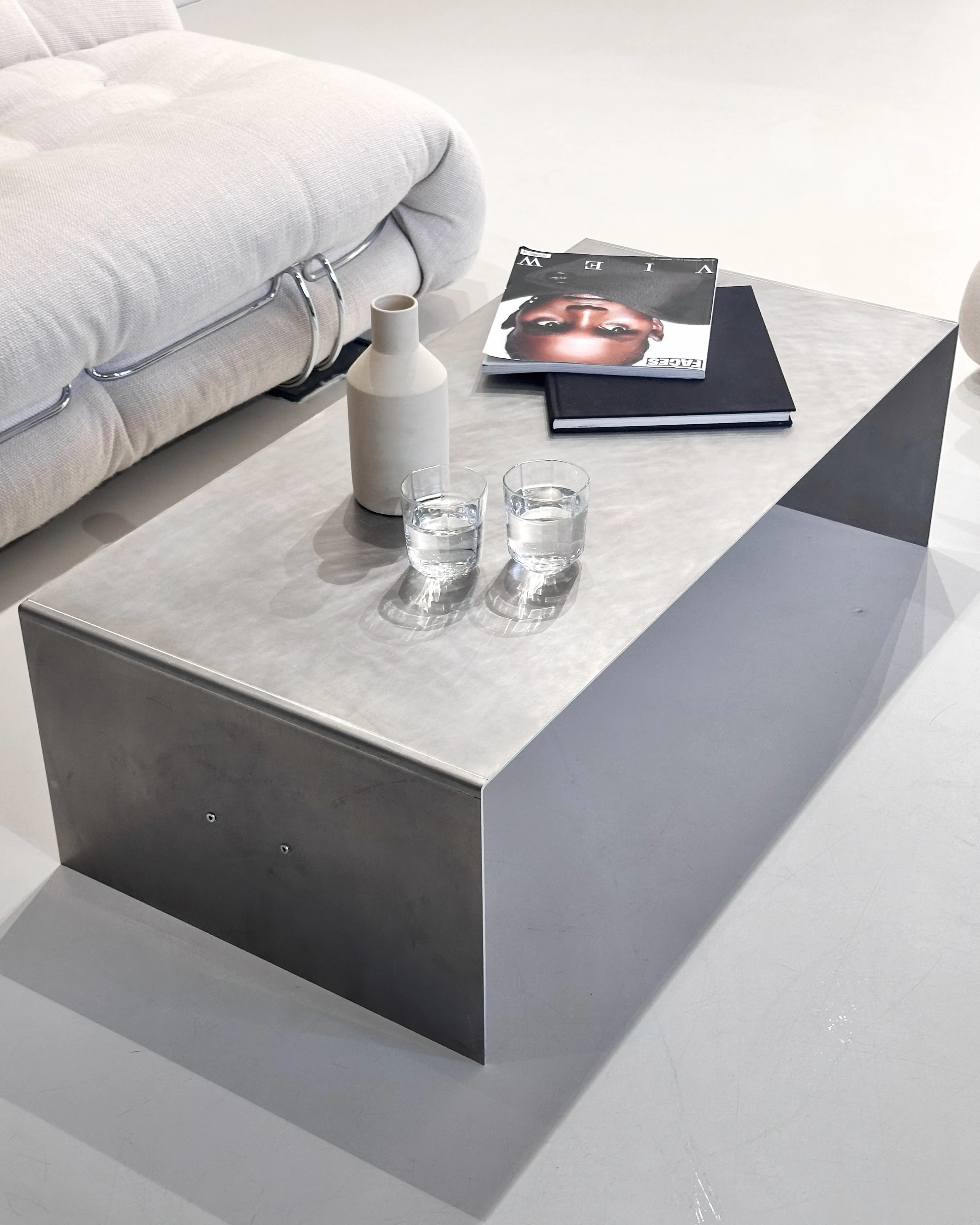 Each table is crafted in Germany from solid aluminum panels — sanded to a soft, even sheen that reduces fingerprints, stains, and scratches. The result is a timeless piece that balances industrial precision with artisanal sensitivity, designed to age beautifully and develop a subtle patina over time.