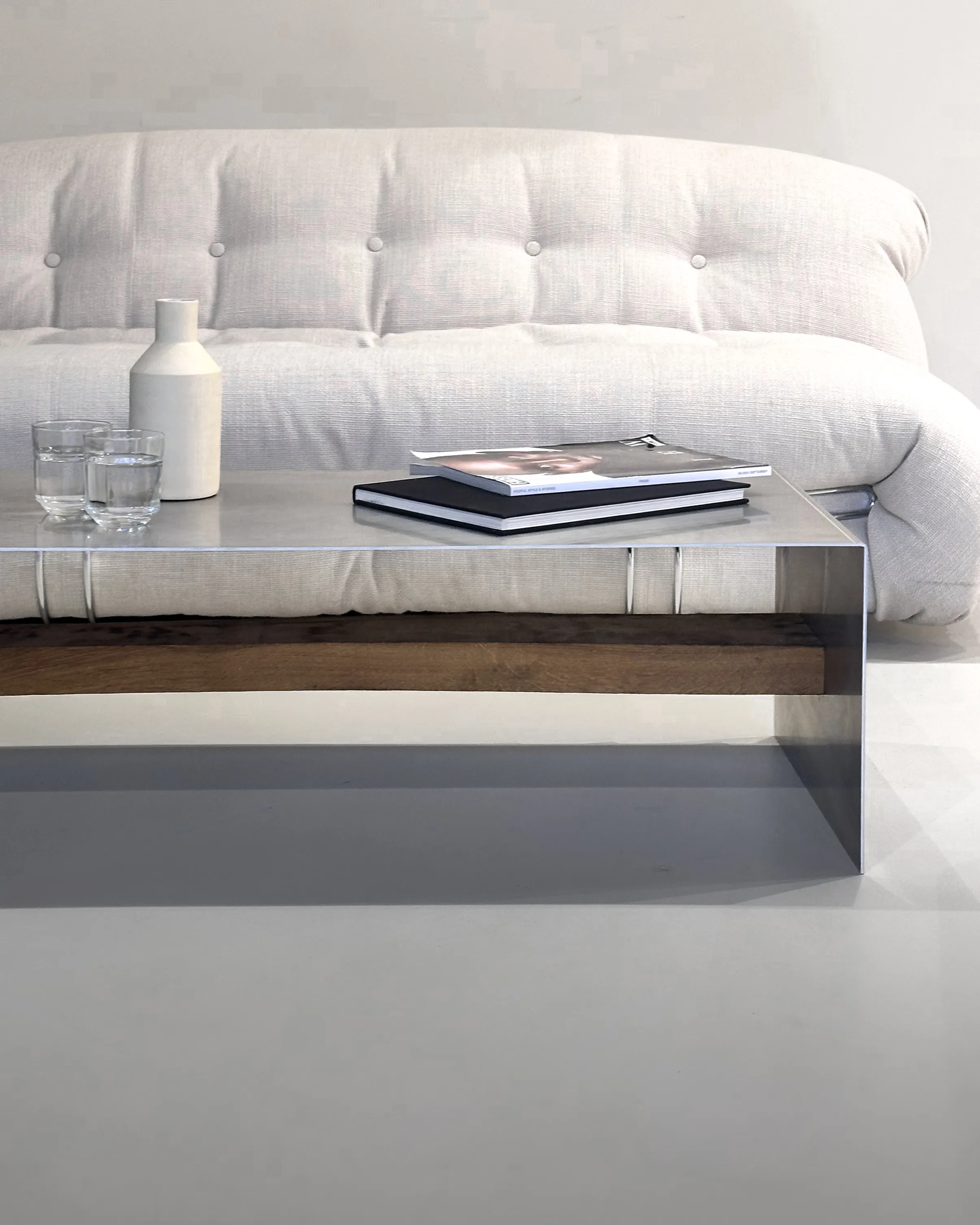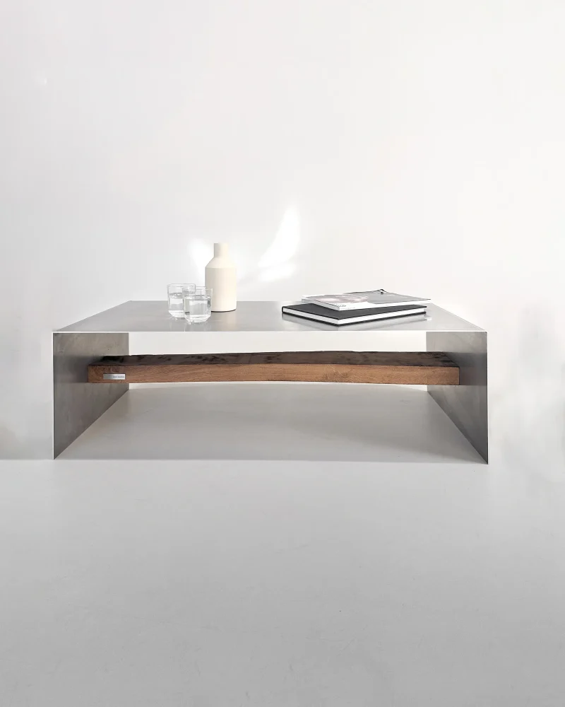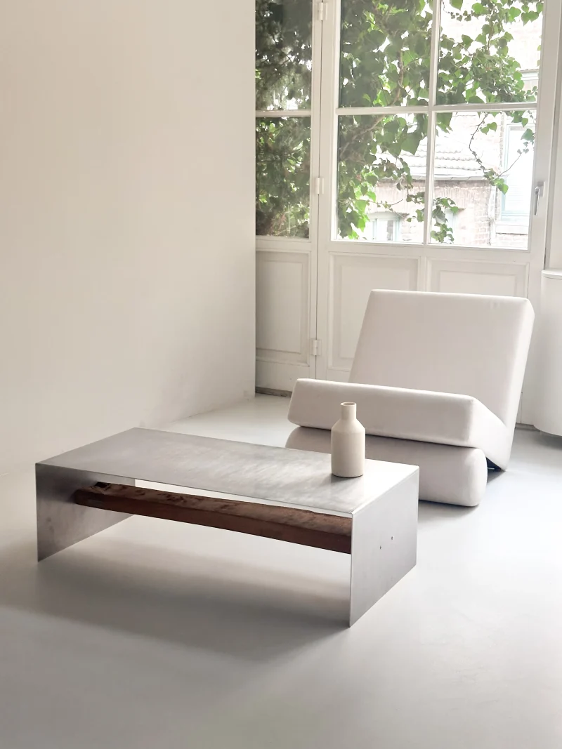 A sculptural statement piece that merges modern craftsmanship and minimalist design. This matte aluminum coffee table is carefully hand-sanded and waxed to achieve a refined, tactile surface that enhances the metal’s natural warmth and depth.