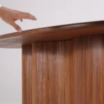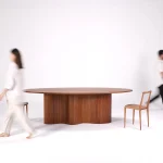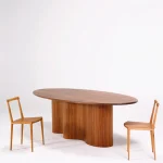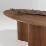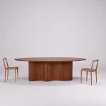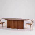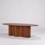 The table is inspired by the fluidity and viscosity of honey. The geometry of the elliptical top with rounded corners rises under an organic base, wavy and asymmetrical where each face presents a new perspective of the whole. When walking around the table the sensation brought to mind resembles the moment where the spoon is turned right before the honey falls so as not to lose it, as if the shape slipped from one side of the base to the other. The table was made of solid wood finished with natural oil. For the base strip planking is used a naval carpentry technique in which all strips have half-circle male/ female fittings, allowing them to curve while connecting and resulting in a smooth, homogeneous surface.