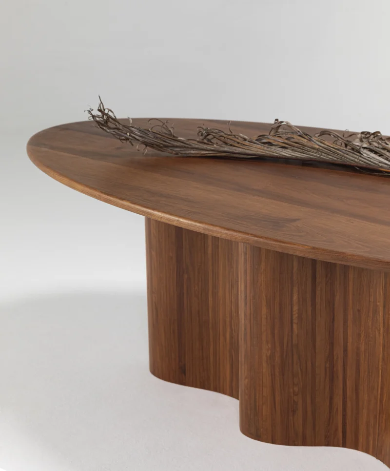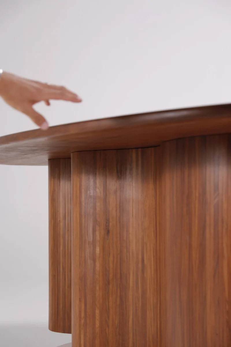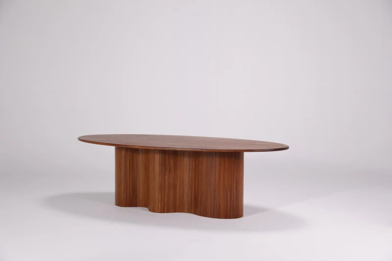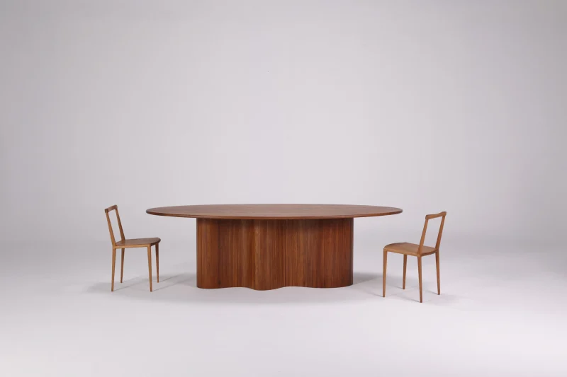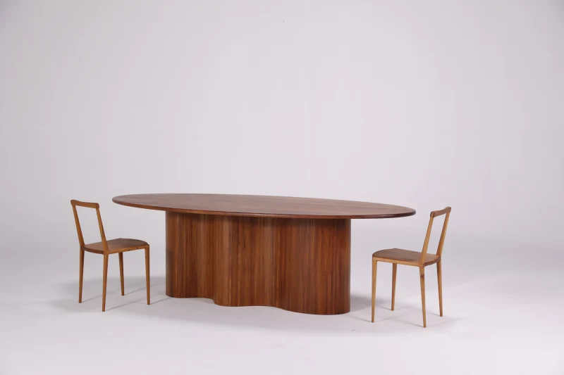 The table is inspired by the fluidity and viscosity of honey. The geometry of the elliptical top with rounded corners rises under an organic base, wavy and asymmetrical where each face presents a new perspective of the whole. When walking around the table the sensation brought to mind resembles the moment where the spoon is turned right before the honey falls so as not to lose it, as if the shape slipped from one side of the base to the other. The table was made of solid wood finished with natural oil. For the base strip planking is used a naval carpentry technique in which all strips have half-circle male/ female fittings, allowing them to curve while connecting and resulting in a smooth, homogeneous surface.