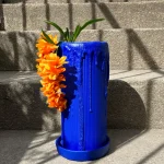 “Melted V.17” is a sculptural vase in blue colour. I try and work with different materials to explore each material’s unique spectrum of qualities such as thickness, viscosities, glossiness, and transparency. This way my works are not “painted” in a traditional sense. Rather, I let the work grow over the course of many layers.
