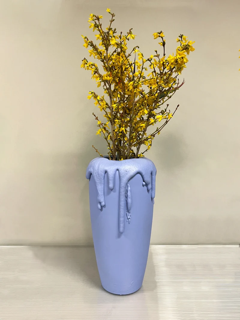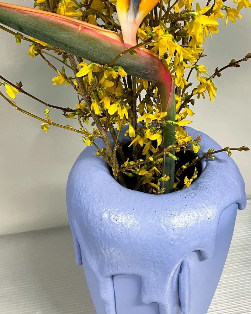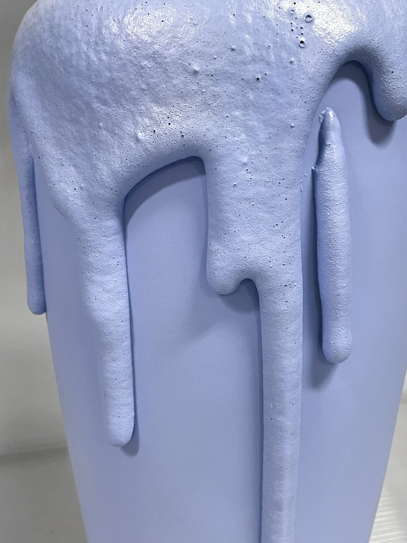 “Melted V.5” is a sculptural vase floor vase in a pastel purple colour. I try and work with different materials to explore each material’s unique spectrum of qualities such as thickness, viscosities, glossiness, and transparency. This way my works are not “painted” in a traditional sense. Rather, I let the work grow over the course of many layers.