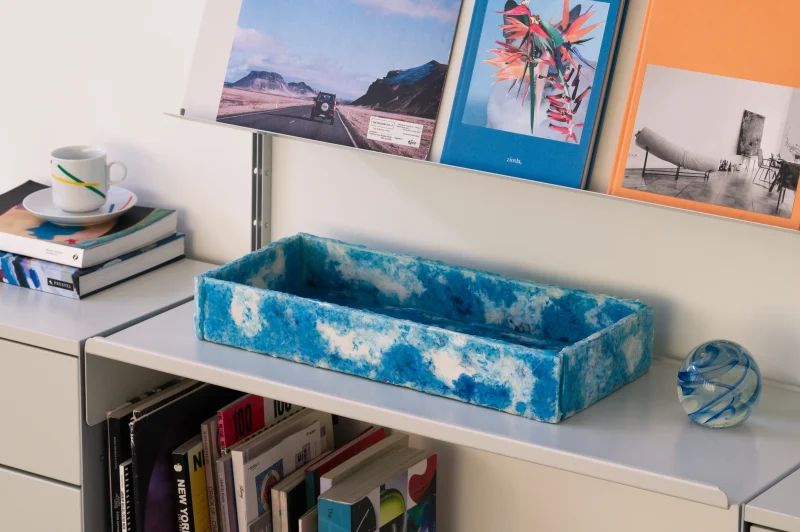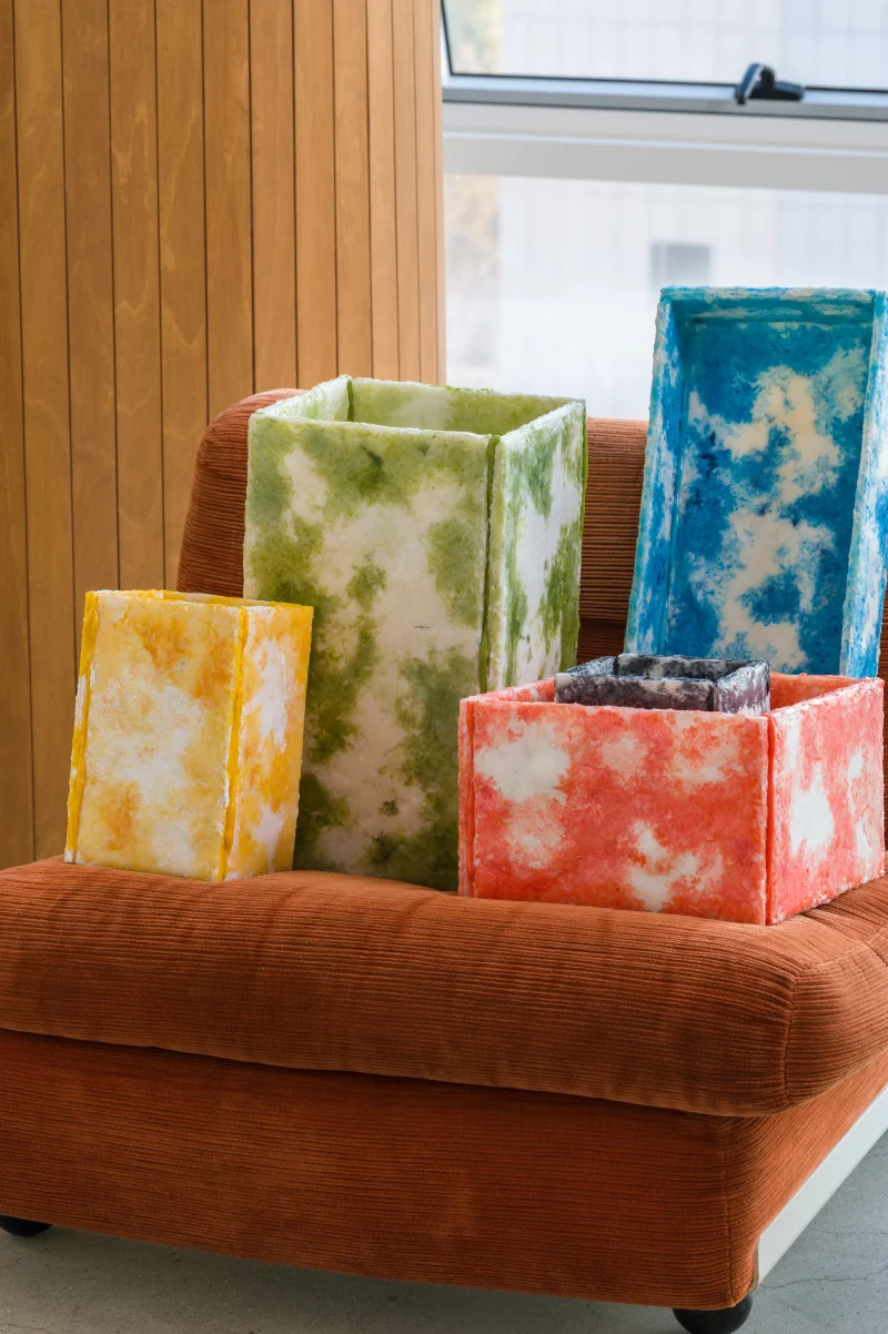 This project is a new way to approach the surface texture of plastic from sustainability issues. I did various chemical experiments with plastic flakes and solvents. I found out about the problem when I visited the prototype factory. I saw so many plastic flakes thrown out of the garbage, not recycled. That is why I focus on this material. The result of the experiment is very interesting as a designer. It looks like melting toppings on pizza in the oven. To have a certain shape, I intentionally placed plastic flakes in the form of a square. I can see the surfaces of melting plastic flakes were twisted and intumescent. After evaporation, I attached two melted plates to express different volumes and textures on both sides. I used only 100% plastic flakes without any other material to harden for the “Melting series.” Each color pigment emphasized the attractive volume of the surface. This cannot be seen on the surface of existing plastic products and pretty much matches our daily lives.