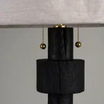 Turned pinewood base with burnt finish and flexible lampshade made with natural linen fabric. The linen shade can be disassembled to be dry-cleaned and can be steamed to remove wrinkles.