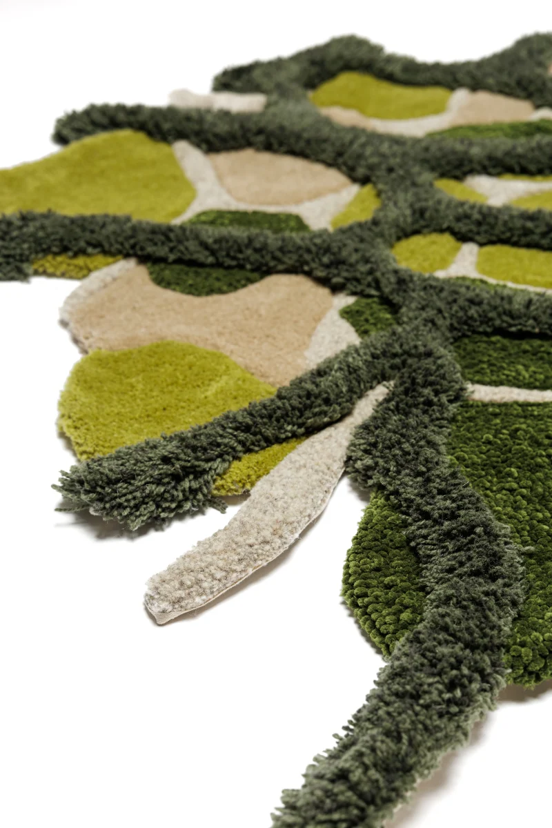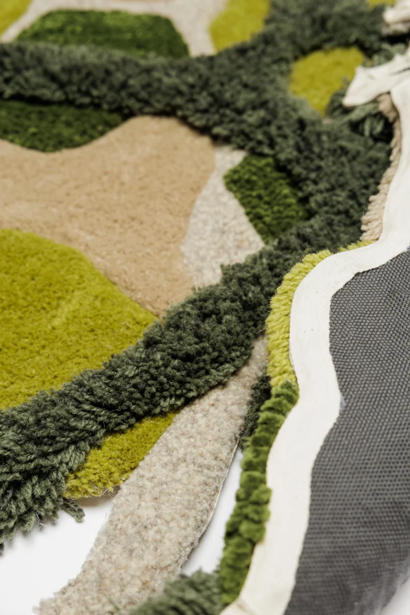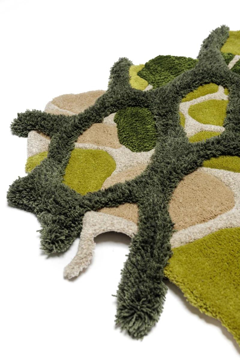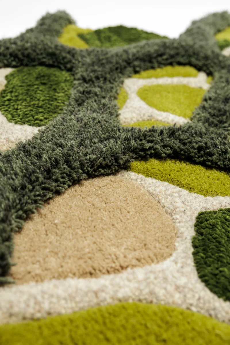 Rendered in rich, vibrant shades of green, the “Micro” rug evokes the depth and variety of the natural world. Its flowing, irregular shapes mirror the textures and forms of magnified plant cells, creating an abstract design that feels both dynamic and serene. The softness of the yarns adds to its tactile appeal, making it as comfortable as it is visually stunning.