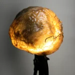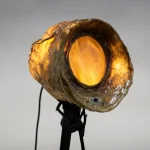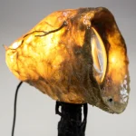 “Sympoietic” by Sabrina Merayo Nuñez intricately weaves the worlds of humans, non-humans, and technology, establishing a profound web of kinship. Drawing inspiration from both modern and medieval techniques, Sabrina has formulated a distinctive recipe for 100% biodegradable collagen-based bioplastic, reminiscent of ancient paint and adhesive preparations. Using this pioneering material, she fashions interactive lighting sculptures that engage with viewers through embedded motion sensors. These sculptures seamlessly incorporate carved artifacts, furniture fragments, veneers, and gleaming crystals.